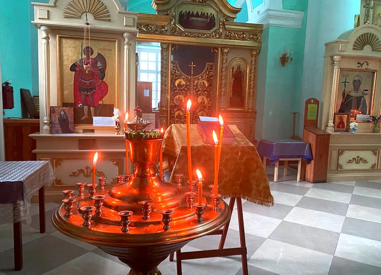 На втором плане открывается вид на величественный многоярусный иконостас, характерный для православных храмов. Слева можно различить образ святого великомученика Георгия Победоносца, а справа — икону Пресвятой Богородицы с Младенцем Христом. Интерьер собора, выполненный в светлых тонах с обильной золочёной отделкой, создаёт ощущение небесного величия и благодати. Особое внимание обращает на себя шахматная плитка пола, добавляющая архитектурной гармонии всему пространству. Общая атмосфера наполнена тишиной, молитвенным покоем и ожиданием начала церковной службы.