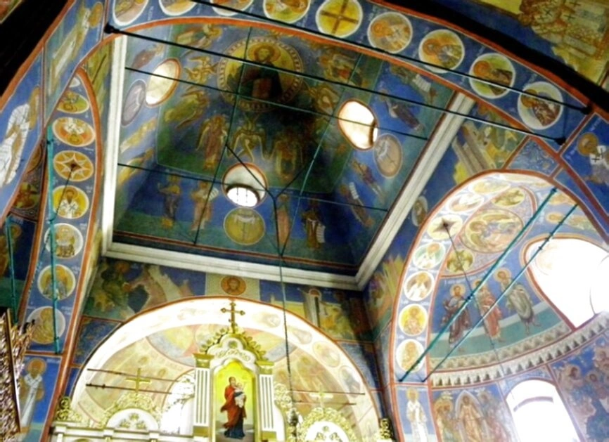 Особое внимание на фотографии уделено уникальной храмовой росписи. Своды и стены собора покрыты библейскими и евангельскими сюжетами, выполненными с глубоким богословским смыслом. Фрески изображают житие Господа нашего Иисуса Христа, лики святых угодников и пророков, а также ключевые события священной истории. Мастерство иконописцев проявляется в гармонии красок и точном следовании канонам православной иконографии.