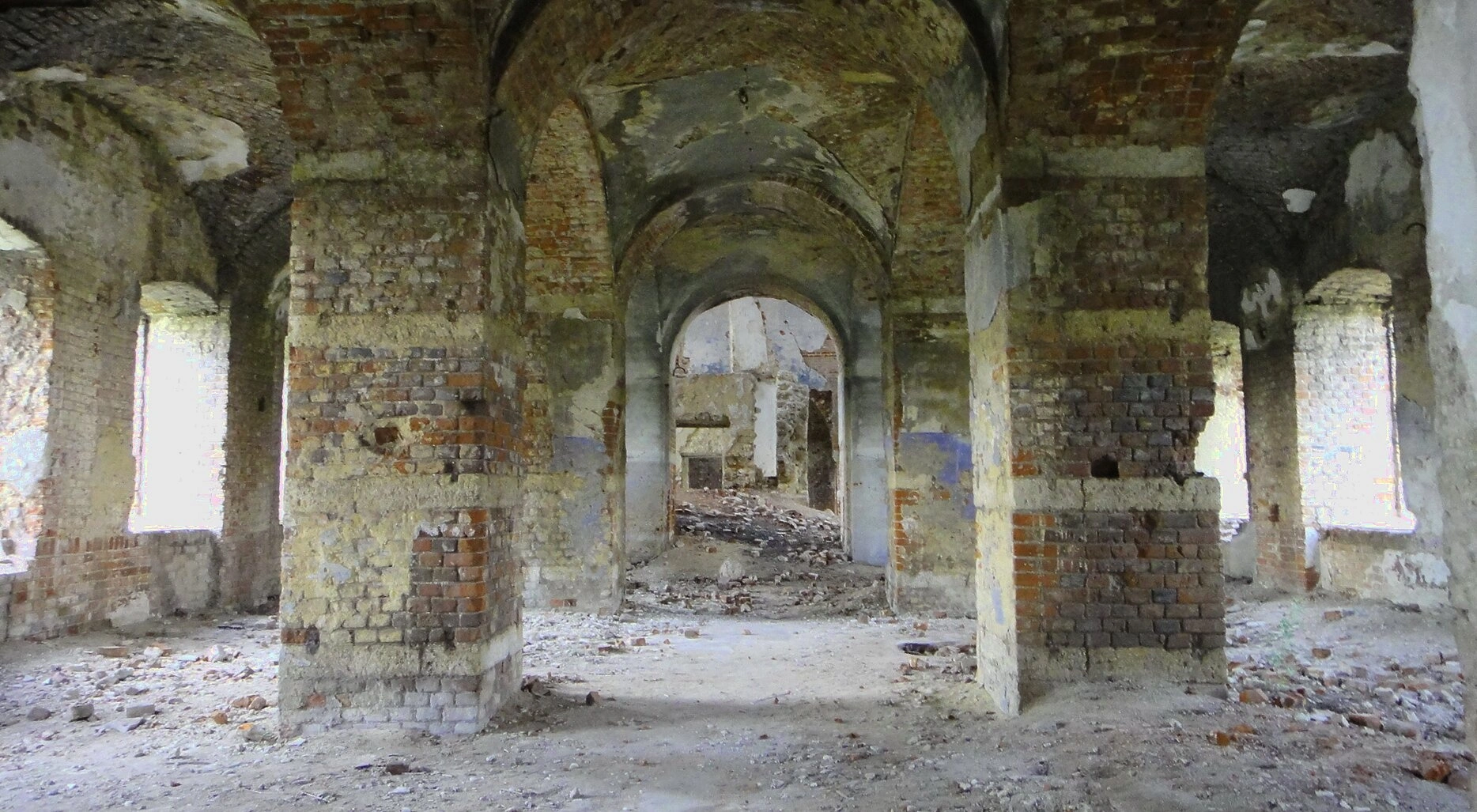 Естественное освещение проникает в интерьер через высокие арочные оконные проемы, лишенные стекол, создавая глубокие тени и подчеркивая архитектурные объемы пространства. Пол храма покрыт слоем строительного мусора, земляной насыпью и фрагментами кирпичной кладки, что свидетельствует о продолжающемся процессе разрушения святого места.
