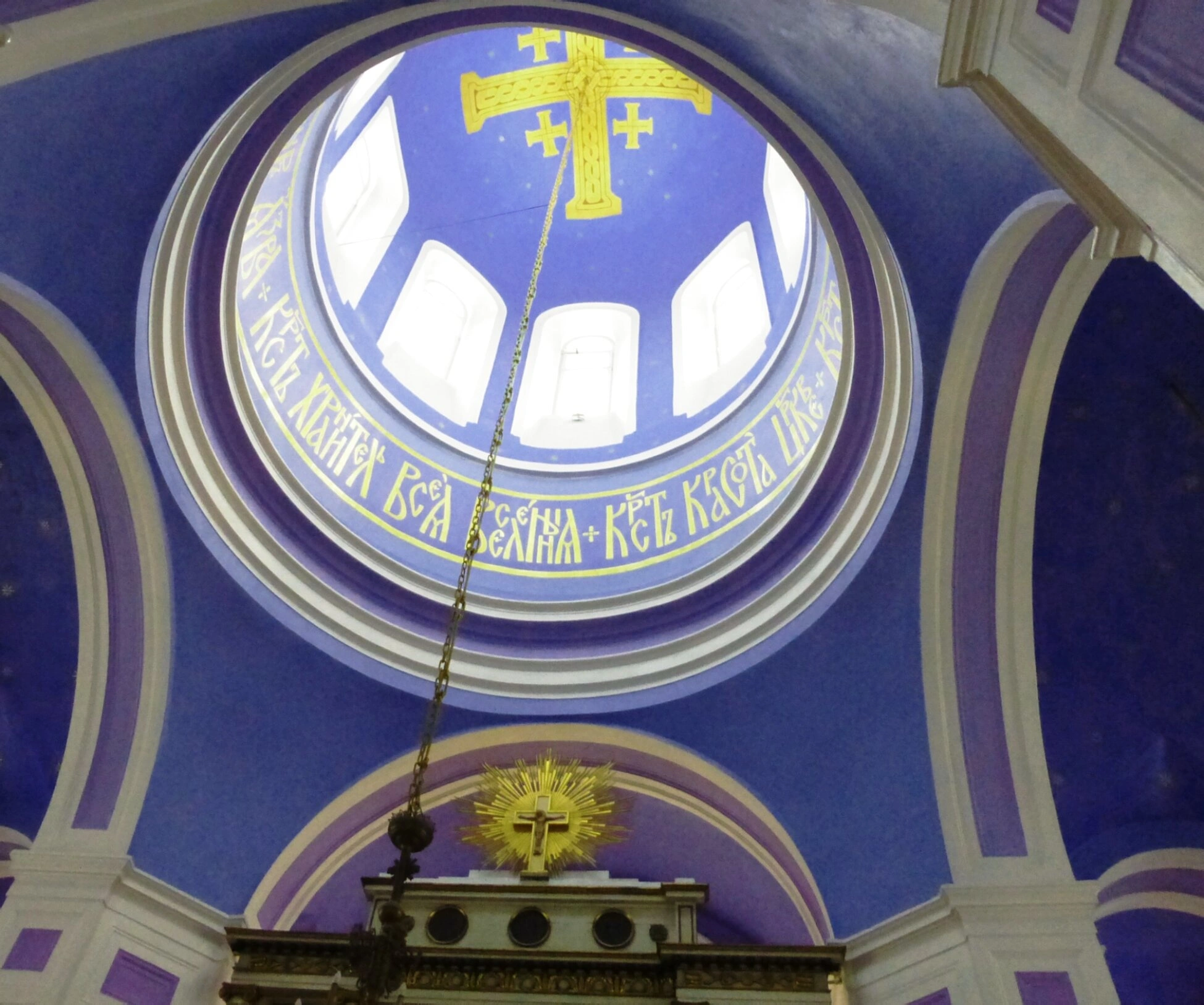 Небесную сферу купола украшает монументальная роспись, выполненная в глубоких лазурных тонах, символизирующих горний мир, и обильно дополненная золотыми орнаментами. Венчает композицию изображение Святого Креста, окружённое сиянием. По периметру барабана купола расположены арочные окна, через которые в пространство храма льётся естественный свет, создающий атмосферу божественного присутствия и озаряющий всё убранство.