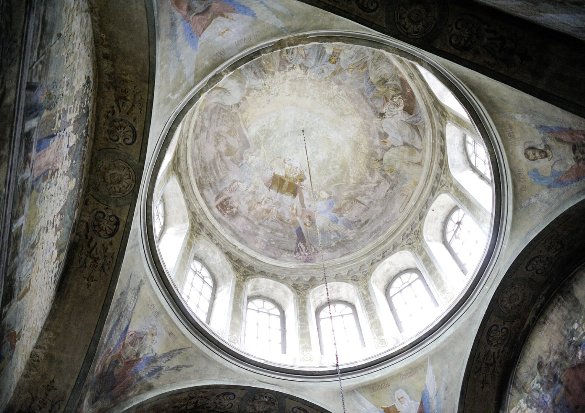 По периметру основания купола расположены арочные оконные проемы, через которые в храм проникает естественное освещение, мягко высвечивающее детали росписи и создающее особую молитвенную атмосферу. Своды, поддерживающие купол, также украшены фресковой живописью, хотя их оформление отличается меньшей детализацией.