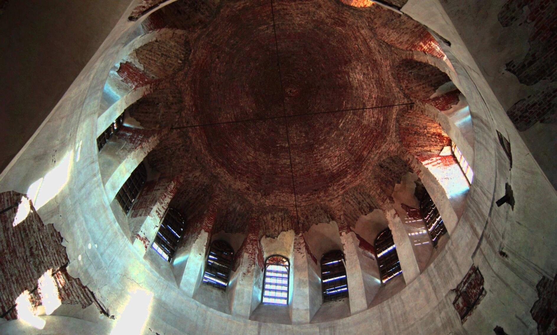 В настоящее время, как видно на фотографии, внутреннее состояние купола свидетельствует о годах запустения. Кирпичная кладка местами обнажена, а штукатурный слой, который ранее покрывал стены изнутри, частично осыпался. Несмотря на это, сохранившиеся архитектурные детали позволяют оценить первоначальное величие замысла зодчих и мастерство строителей, возводивших этот храм. Сам купол, первоначально выполненный из белой жести, к настоящему времени утрачен.