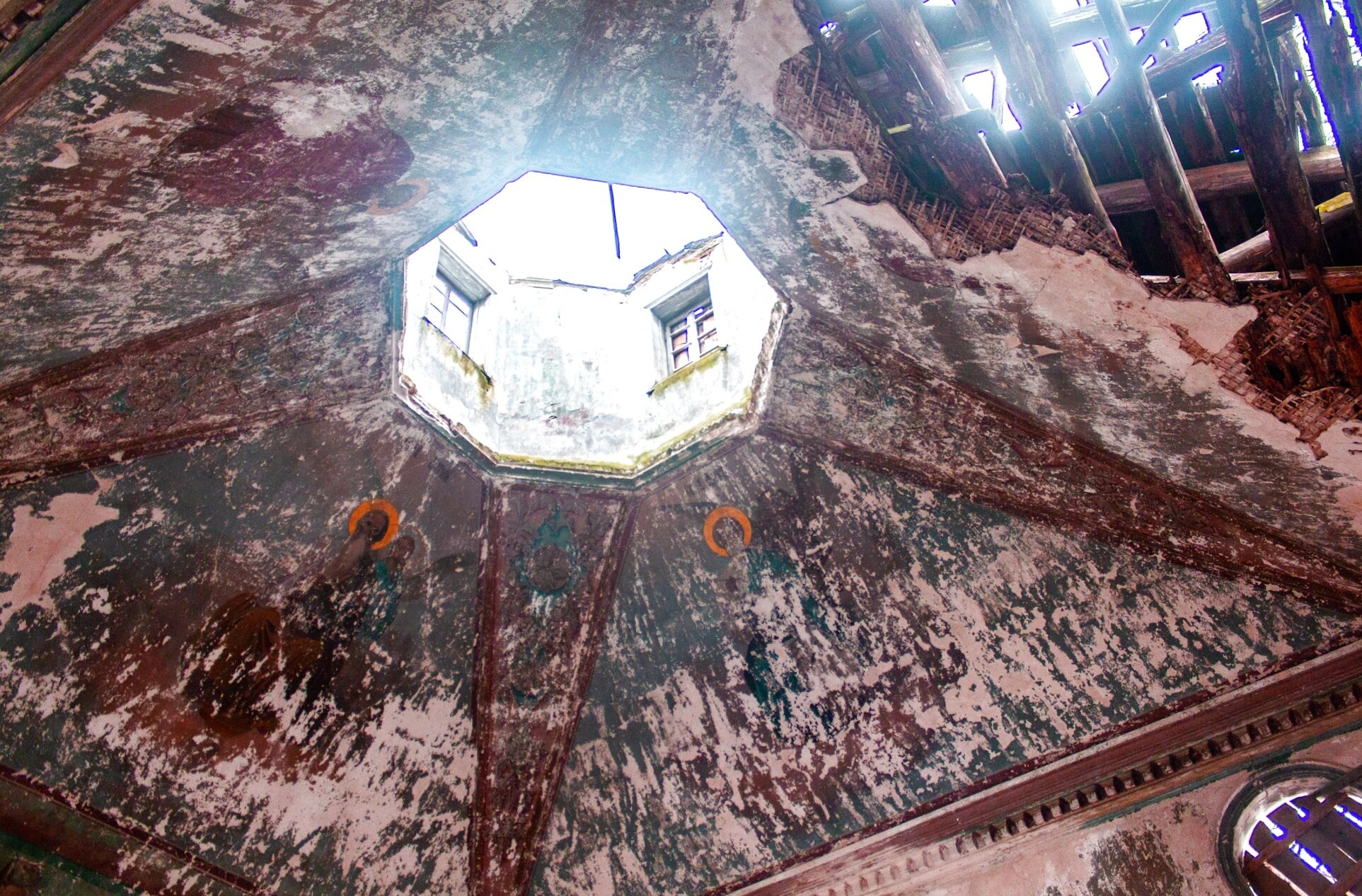 Съёмка выполнена снизу вверх, что позволяет детально рассмотреть конструкцию восьмигранного купола с центральным световым отверстием. Через это отверстие проникает естественное освещение, высвечивающее фрагменты сохранившейся храмовой росписи. В лучах света видны остатки декоративных элементов, выполненных в традициях православной иконографии.