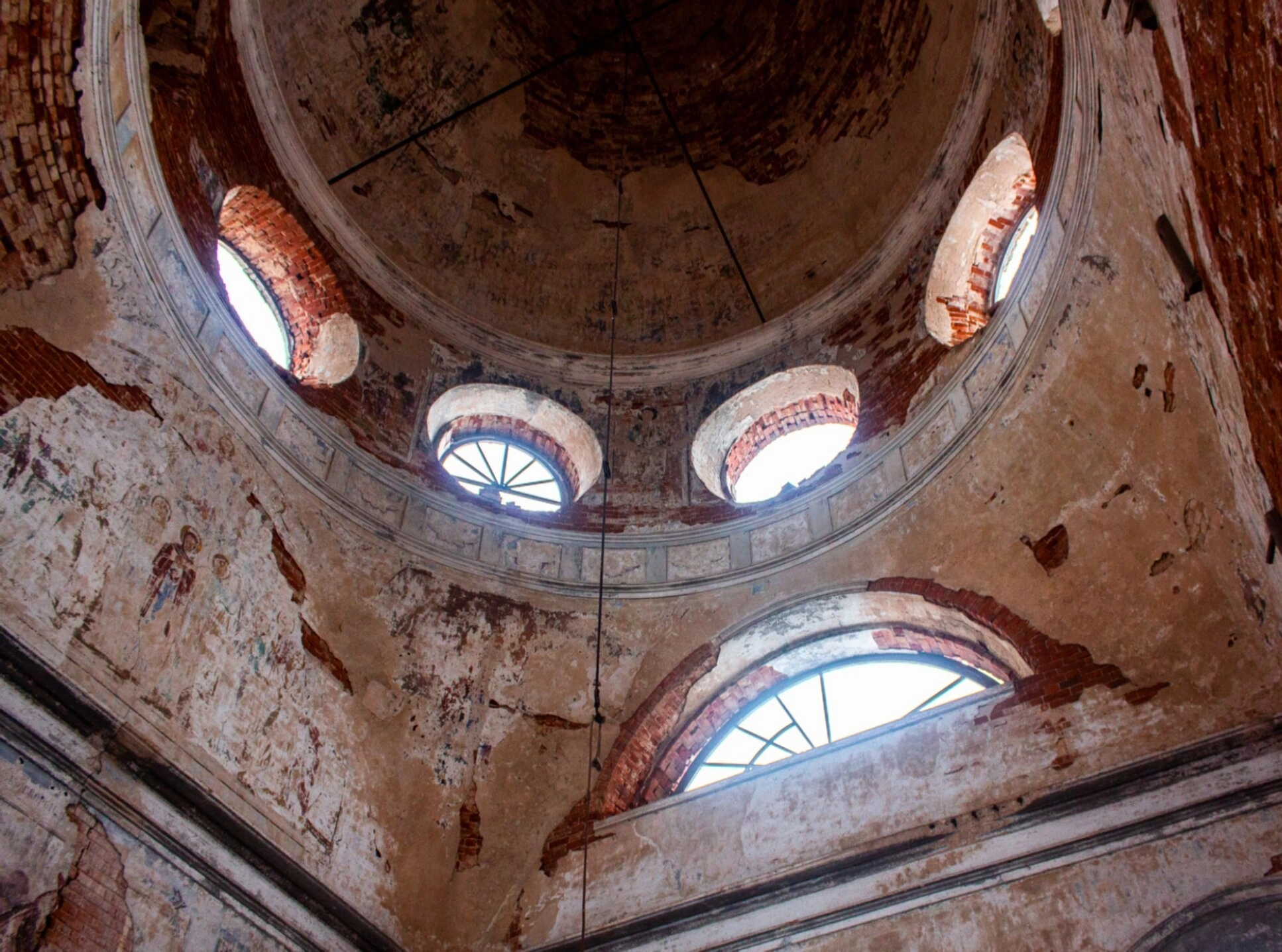 Подкупольное пространство храма демонстрирует серьезные повреждения конструкций. Кирпичная кладка сводов обнажена, штукатурный слой осыпался, оставив лишь фрагментарные следы былой отделки. В барабане купола сохранились четыре круглых окна-люнеты, через которые в храмовое пространство проникает естественный свет, символически напоминая о Божественном свете, некогда озарявшем эту святыню.