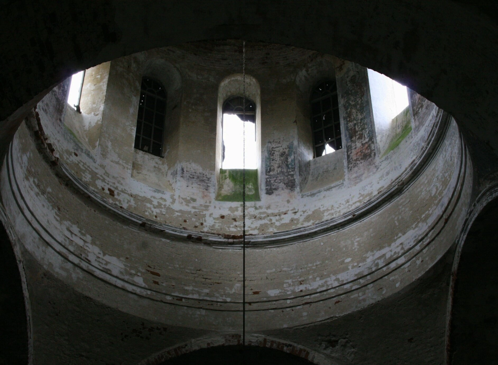 Освещённый лучами естественного света, проникающего через оконные проёмы в барабане, купол являет собой одновременно печальное и прекрасное зрелище. Со стен осыпается штукатурка, обнажая кирпичную кладку и утраченные навсегда фрески. Несмотря на разруху, угадываются черты былого благолепия и величия этого дома Божьего, архитектура которого характерна для русского церковного зодчества.