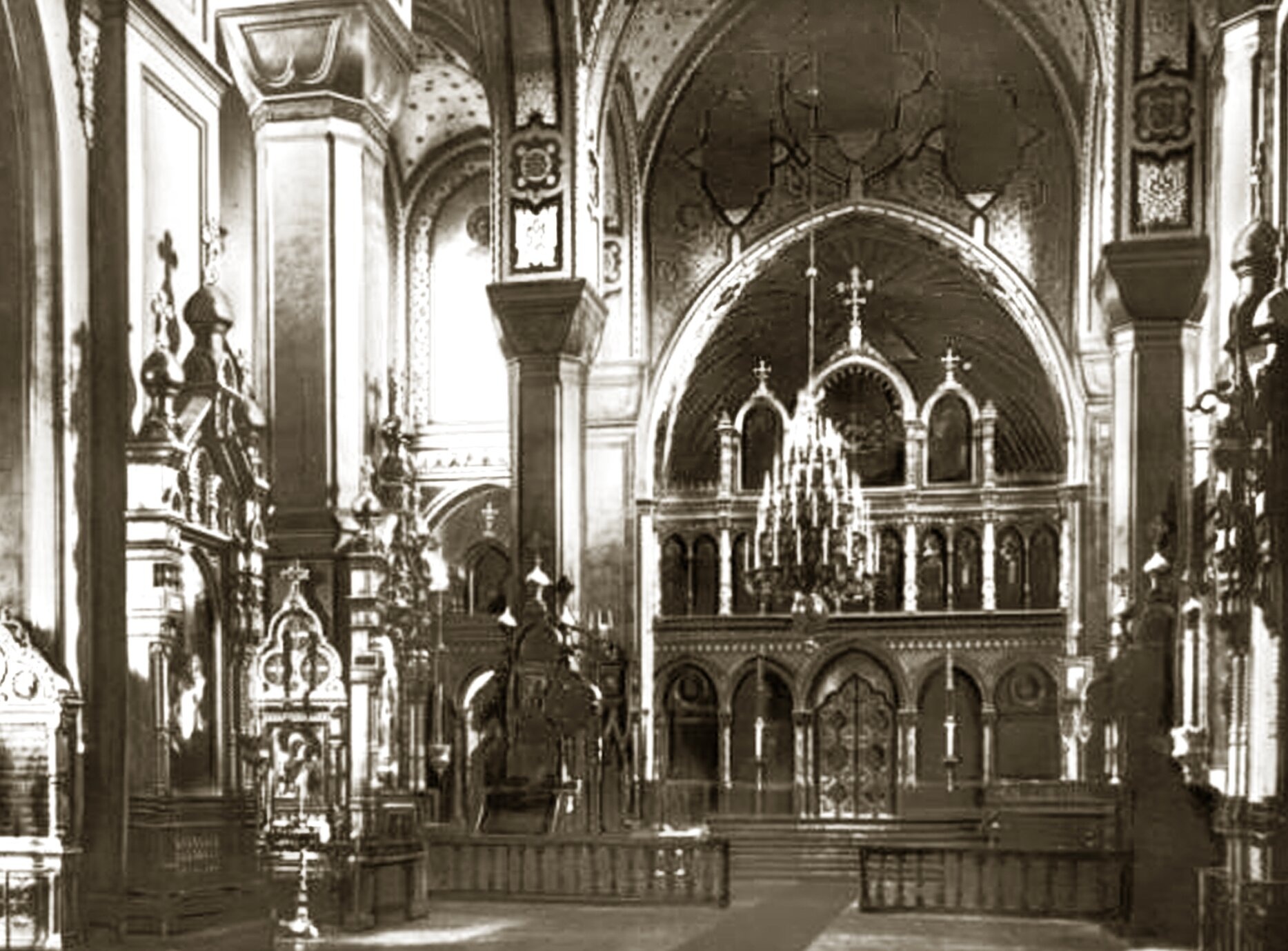 На архивной фотографии запечатлён величественный интерьер домового храма во имя священномученика Мирония, принадлежавшего лейб-гвардии Егерскому полку, который располагался в Санкт-Петербурге на набережной Обводного канала. Центральное место на снимке занимает трёхъярусный главный иконостас, искусно вырезанный из дерева и украшенный позолотой. Этот иконостас был создан по эскизу академика архитектуры Константина Андреевича Тона охтинским мастером-позолотником Е. Скворцовым. Большинство священных образов для иконостаса были написаны известными живописцами, включая Михаила Скотти и Петра Титова. Пространство перед алтарной преградой освещает большая храмовая люстра, чей свет отражается на поверхностях массивных колонн, разделяющих зал. Стены и своды храма были богато украшены росписями, выполненными такими художниками, как Алексей Марков, Пётр Шамшин и Фёдор Завьялов. В убранстве церкви особое место занимали полковые святыни: на стенах находились Георгиевские знамёна, пожалованные полку за подвиг в сражении при Кульме, а также золочёные бронзовые доски с именами павших офицеров, начиная с князя Багратиона. В специальных витринах хранились мундиры августейших шефов. Таким образом, фотография доносит до нас образ не просто великолепного памятника русско-византийского стиля, но и воинской святыни, имевшей глубокое историческое и мемориальное значение для лейб-гвардии Егерского полка.