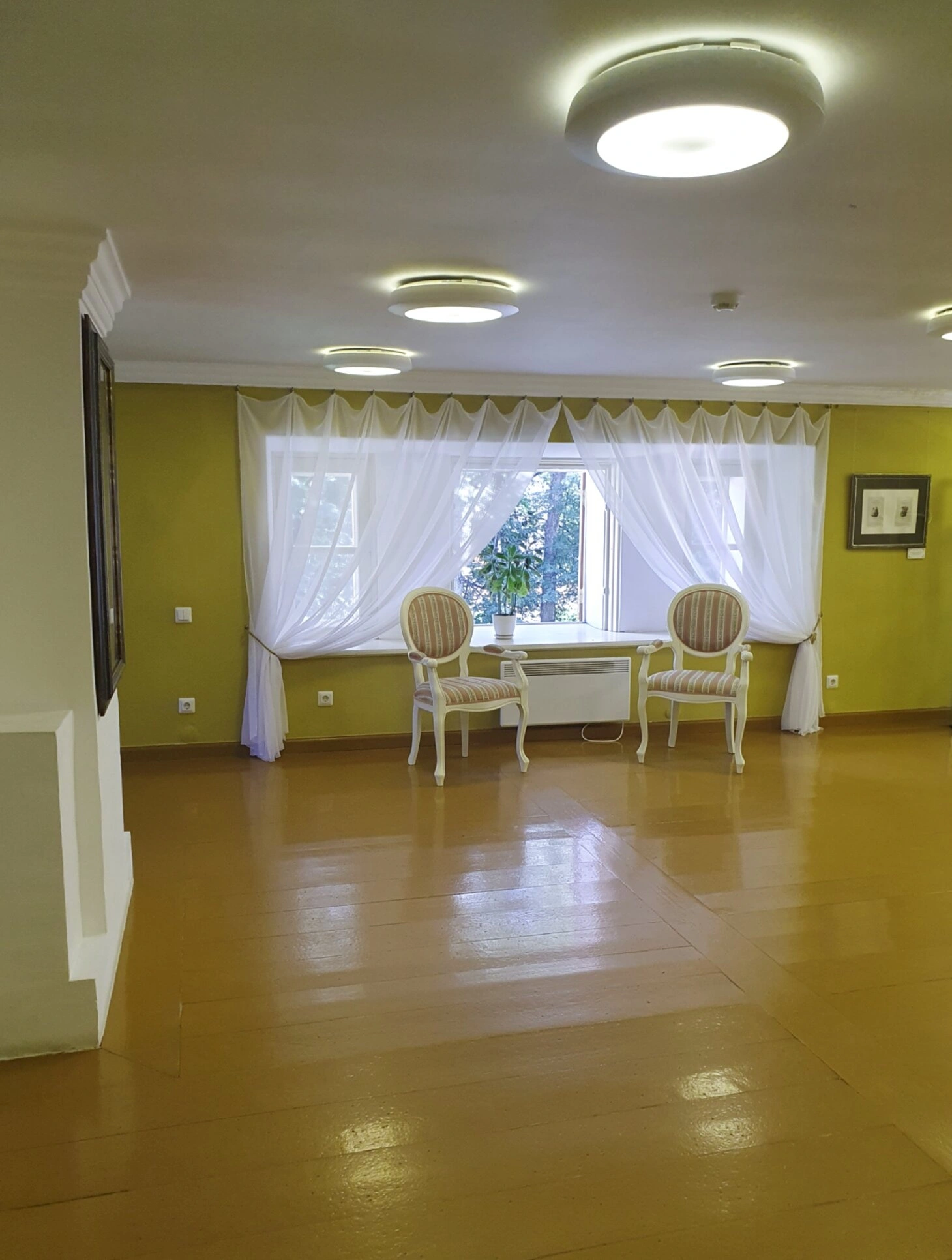 Просторное окно, занавешенное белыми полупрозрачными шторами, наполняет помещение естественным светом, что характерно для музейных экспозиций, требующих хорошего освещения. Два кресла с полосатой обивкой, установленные перед окном, вероятно, являются частью исторического интерьера и представляют собой образцы мебели соответствующей эпохи.