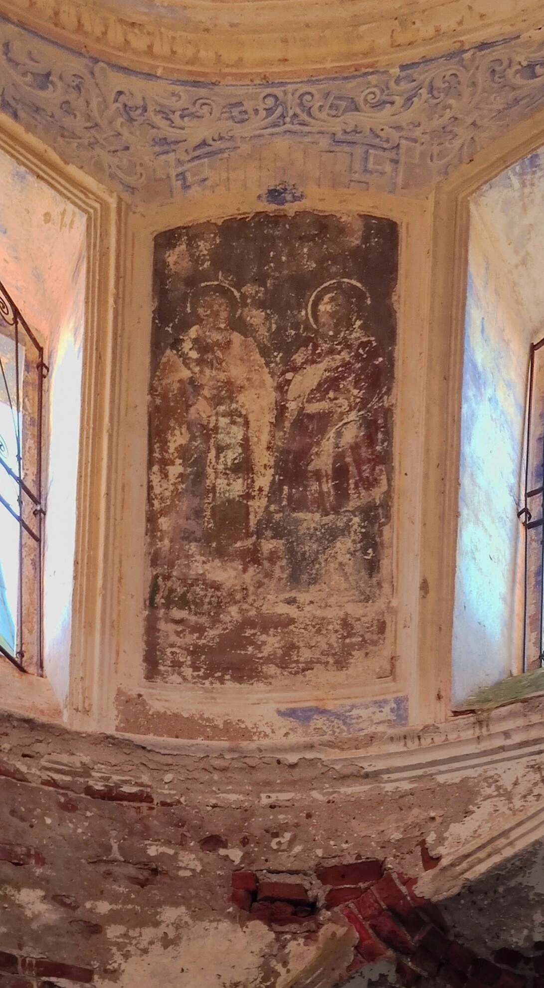 Между двумя арочными оконными проемами сохранился фрагмент настенной фрески, изображающей двух святых в нимбах. Ликовы́е изображения и одеяния святых значительно повреждены временем, однако просматриваются очертания фигур, выполненные в традиционной православной иконописной манере. Фреска свидетельствует о высоком уровне мастерства древних русских иконописцев.