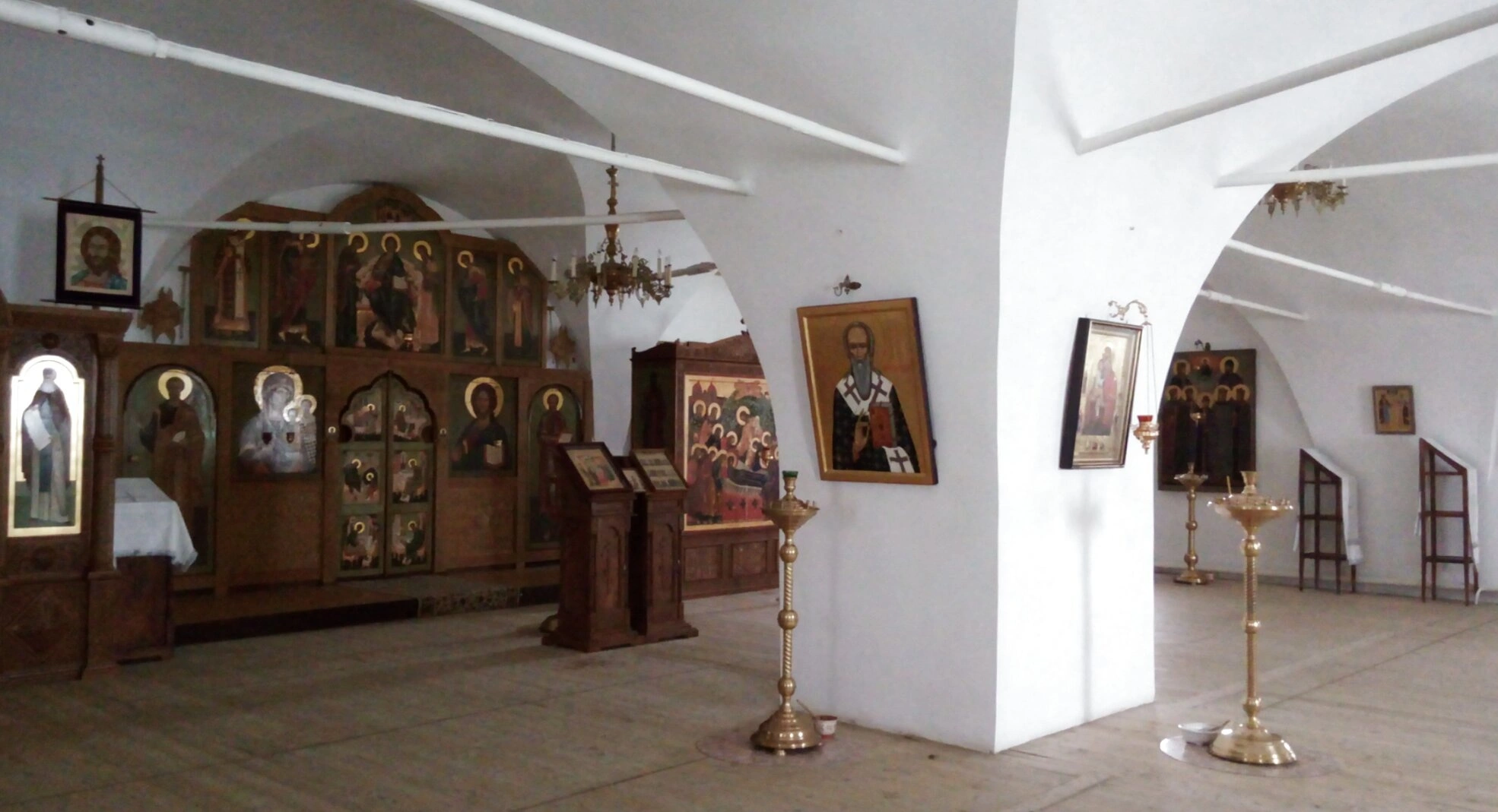 Стены и опорные колонны храма также украшены многочисленными иконами в нарядных киотах и окладах. Перед ними установлены старинные подсвечники, предназначенные для возжжения свечей благочестивыми прихожанами. Всё пространство наполнено элементами церковной утвари, создающими особую молитвенную атмосферу.