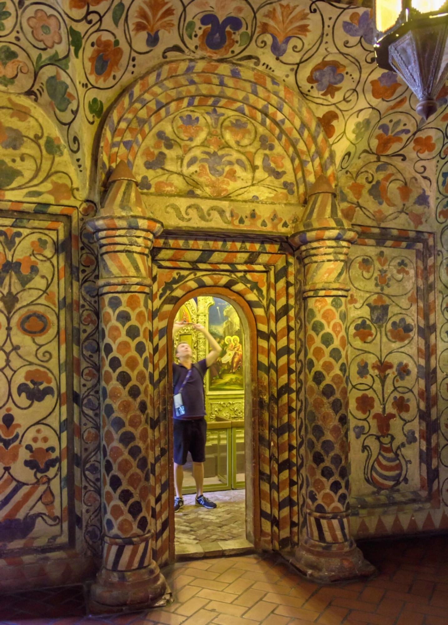 В центре композиции фотографии находится арочный дверной проём, ведущий, вероятно, в один из пределов или соединяющий части собора. Арка и массивные колонны, её обрамляющие, сплошь покрыты уникальной многослойной росписью, выполненной в традиционном русском стиле. Узоры включают в себя замысловатые растительные побеги, стилизованные цветы и чешуйчатый орнамент, символизирующий Небесный Иерусалим и горний мир. Цветовая гамма, построенная на сочетании киноварно-красного, лазурно-синего, зелёного, золотисто-жёлтого и чистого белого цветов, создаёт ощущение праздничности и духовной радости, характерное для московского узорочья.