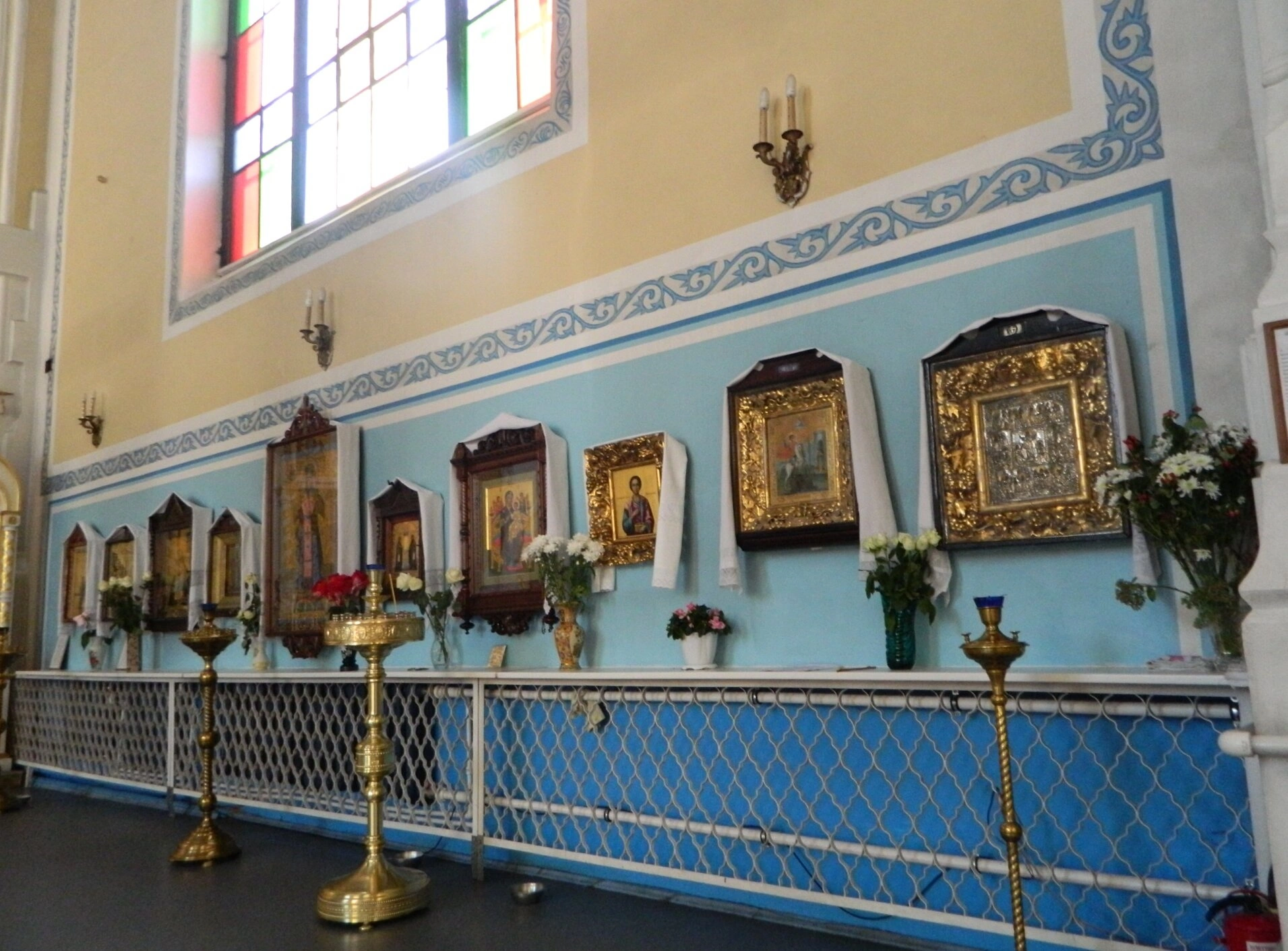 Стена храмового помещения разделена на две части согласно традиционной цветовой гамме православных церквей. Верхняя часть окрашена в тёплый светло-желтый цвет, символизирующий благодать и духовное просвещение, тогда как нижняя часть выполнена в небесном голубом оттенке, напоминающем о горнем мире. Граница между цветовыми зонами украшена изящным декоративным фризом с синим орнаментальным узором, что придает интерьеру особую торжественность.
