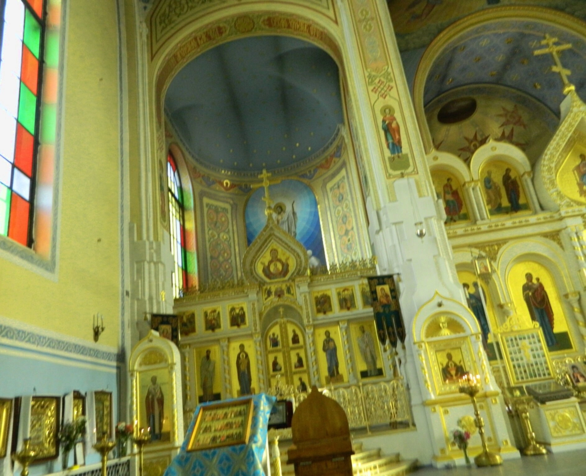 На фотографии запечатлён величественный интерьер Покровского собора, расположенного в городе Гатчине Ленинградской области. Этот православный храм, освящённый в честь Покрова Пресвятой Богородицы, представляет собой выдающийся образец церковной архитектуры и духовной культуры.