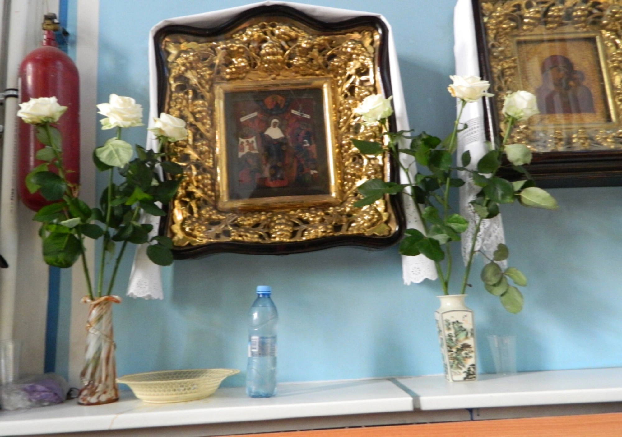 Справа от центрального образа расположена икона в строгой тёмной раме, что характерно для многих храмовых изображений. Оба образа находятся на стене, выкрашенной в голубой цвет, символизирующий небесную чистоту и Богородичное начало в православной иконографии.