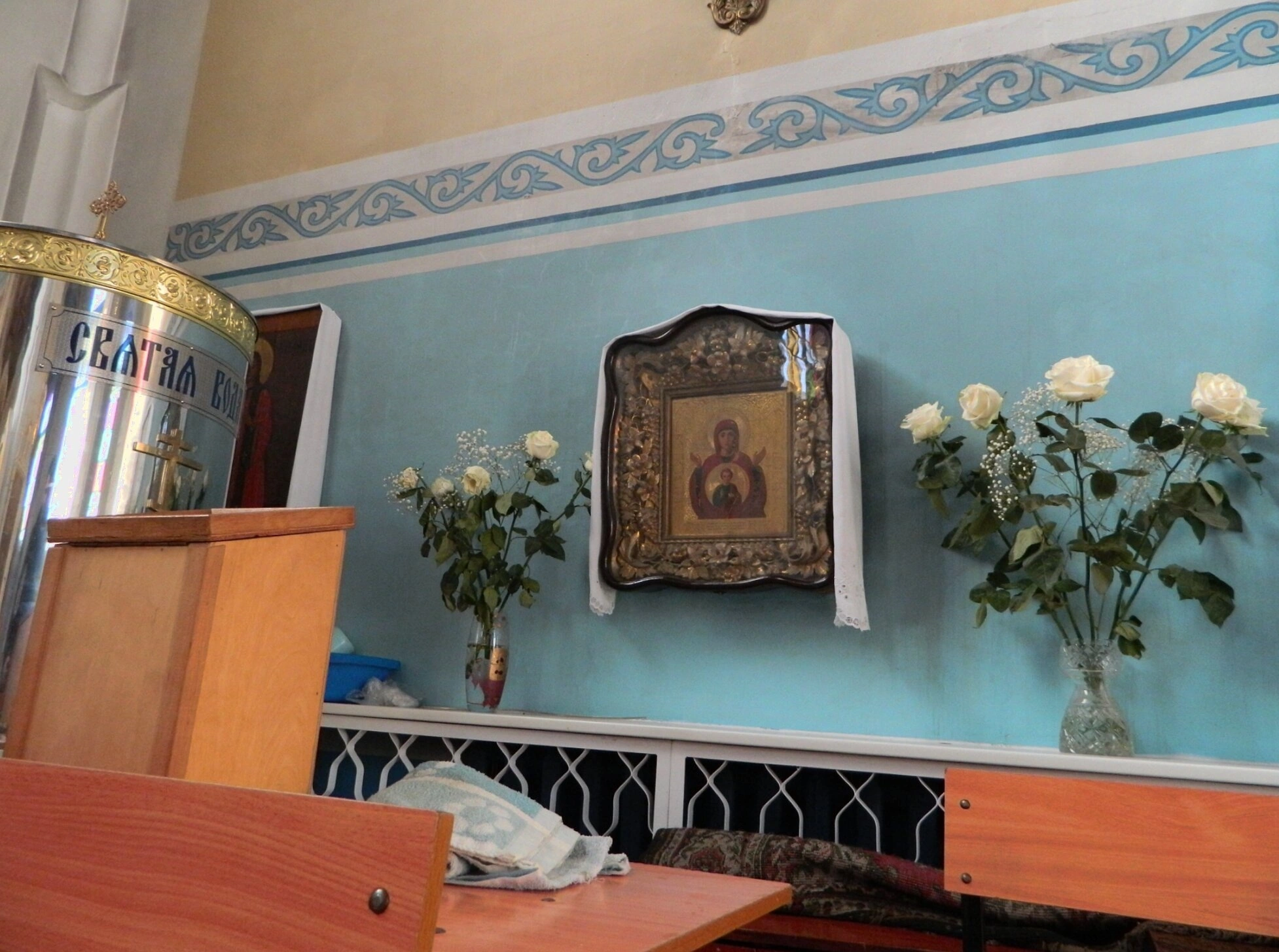 Стены храма окрашены в небесно-голубой цвет, символизирующий чистоту и духовность. Под потолком проходит изящный декоративный фриз, украшенный синим орнаментом, который придаёт интерьеру завершённость и гармонию. Подобное цветовое решение создаёт ощущение лёгкости и возвышенности.