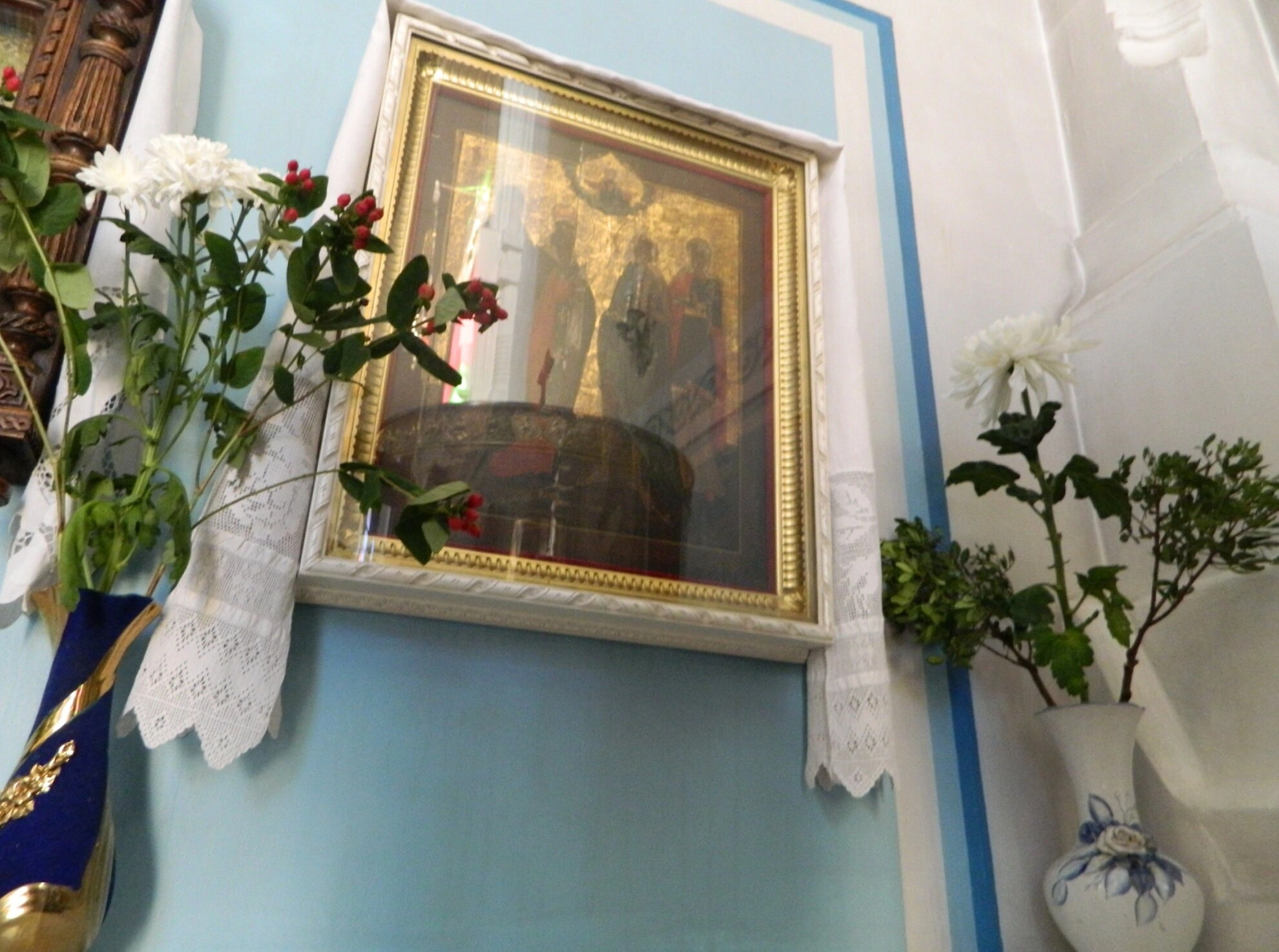 Стены храма выдержаны в светло-голубых тонах, символизирующих небесную чистоту и благодать, с фрагментарно видимыми белыми поверхностями, украшенными синими декоративными полосами. В левой части кадра различима часть другой, более древней иконы в тёмном окладе, свидетельствующей о многообразии святынь собора. Всё убранство demonstrates тщательно продуманную симметрию и глубокую символику, характерную для православной храмовой культуры.