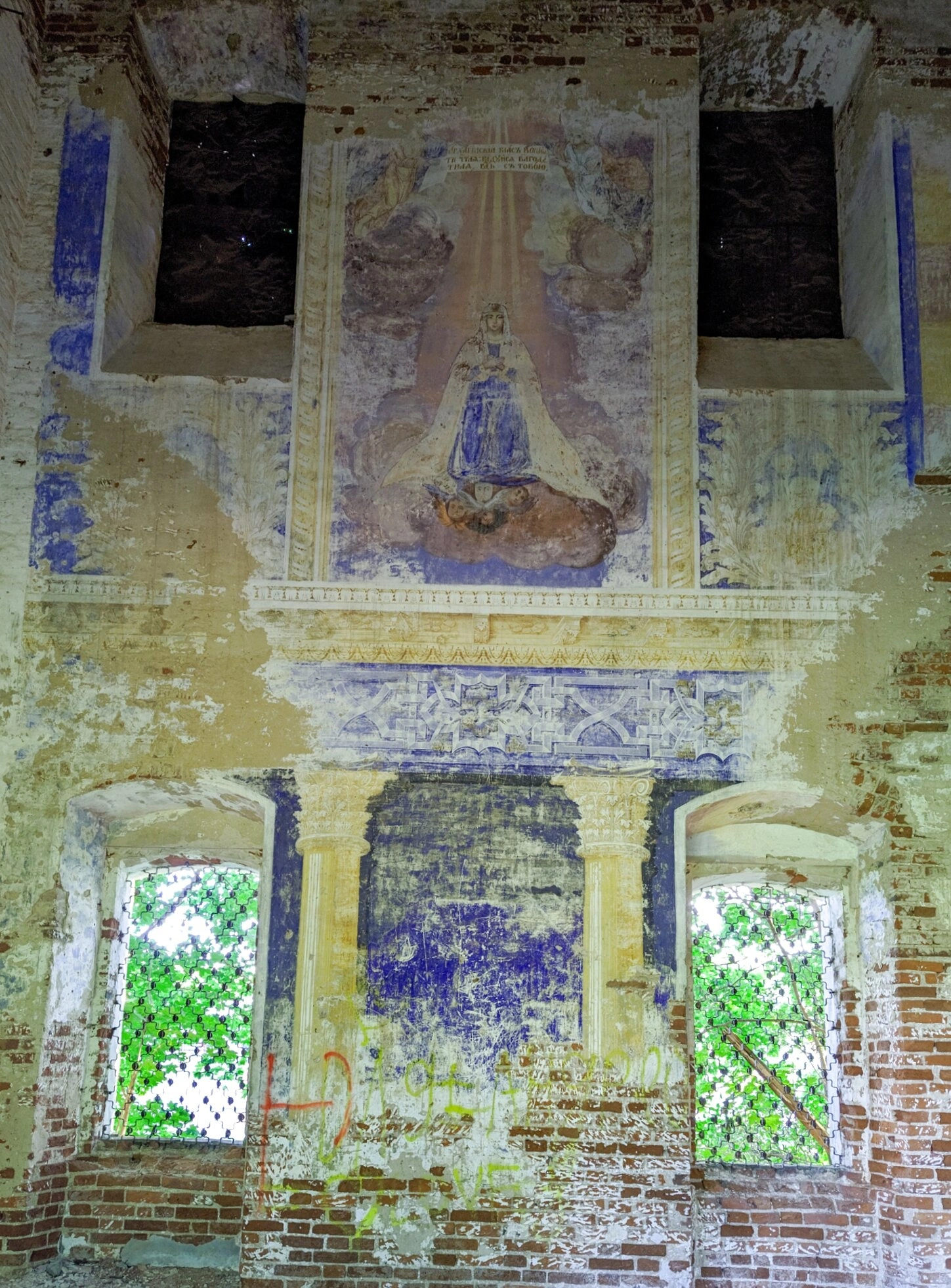 На представленном снимке запечатлён скорбный и в то же время величественный вид интерьера храма Покрова Пресвятой Богородицы, что расположен в селе Брюхово Суздальского района Владимирской области. Некогда благодатное место для молитвы ныне пребывает в запустении, однако даже сквозь слои времени и разрухи проступает былое благолепие дома Божия.