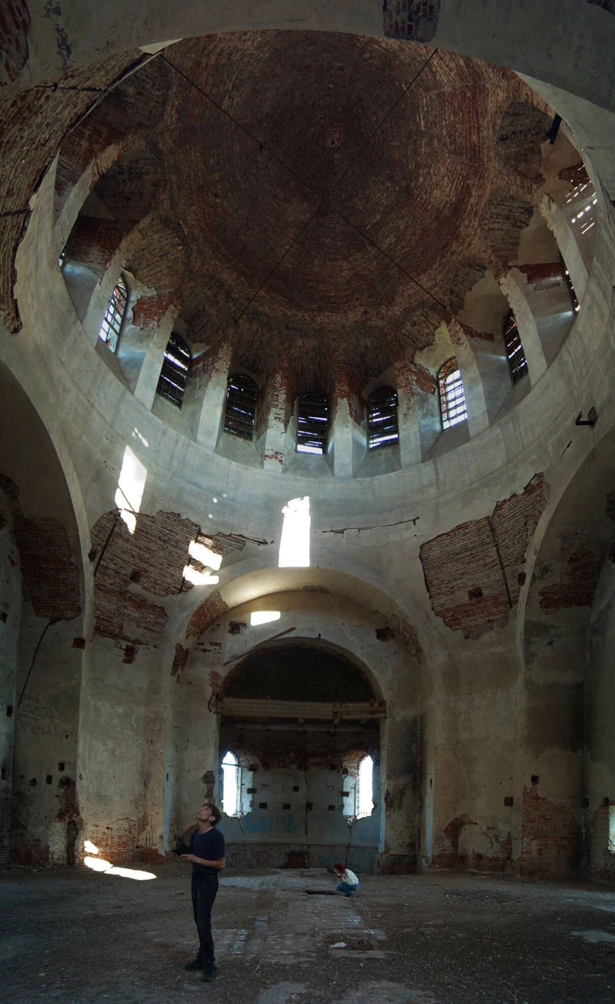 Внутреннее убранство храма полностью утрачено: не сохранилось следов настенных росписей, а полы, некогда покрытые метлахской плиткой, ныне завалены обломками. Состояние интерьера плачевно: кладка стен местами разрушена, а для предотвращения обрушения главный купол стянут стальными тросами. Две человеческие фигуры, виднеющиеся в центре кадра, позволяют осознать грандиозные масштабы этого некогда величественного сооружения.