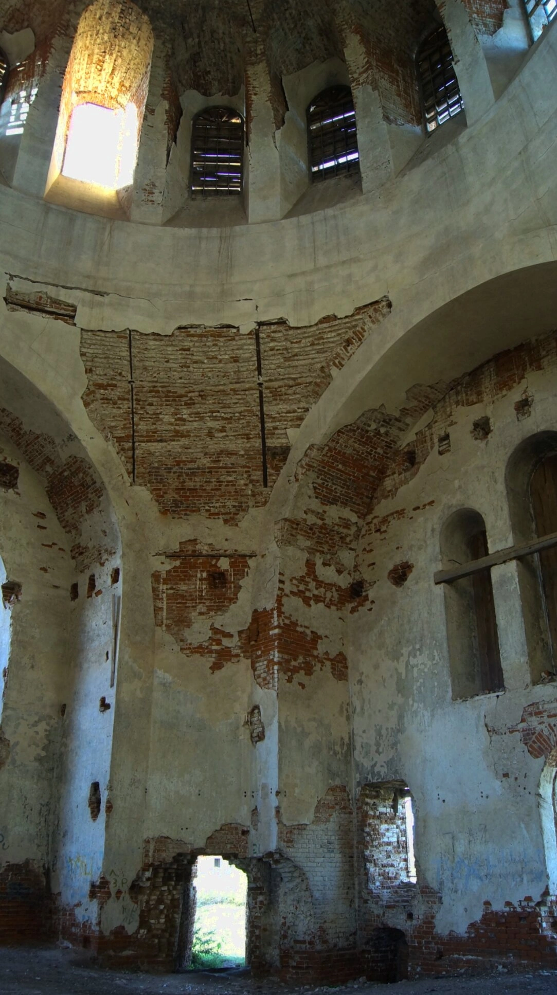 Фотография запечатлела внутреннее пространство храма Покрова Пресвятой Богородицы в селе Красная Река, ныне пребывающего в запустении. Снимок, сделанный снизу вверх, открывает вид на величественные своды этого некогда благолепного места. Несмотря на плачевное состояние, когда большая часть штукатурки обвалилась, обнажив кирпичную кладку стен и сводов, архитектурная мощь строения продолжает поражать. Арочные оконные проемы, через которые проникает дневной свет, напоминают о первоначальном предназначении здания как дома молитвы.