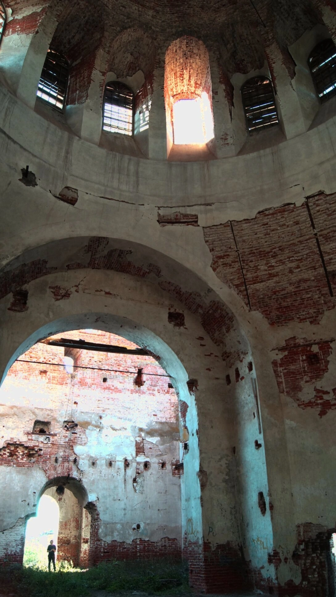 Храм в честь Покрова Пресвятой Богородицы, ныне пребывающий в запустении, был возведён в традициях русского церковного зодчества. На фотографии явственно просматриваются характерные элементы православной храмовой архитектуры — арочные проёмы и сводчатые перекрытия, которые, увы, ныне находятся в плачевном состоянии. Особую атмосферу скорби создают проёмы в куполе, через которые проникает дневной свет, символически напоминая о необходимости духовного просвещения этого места.