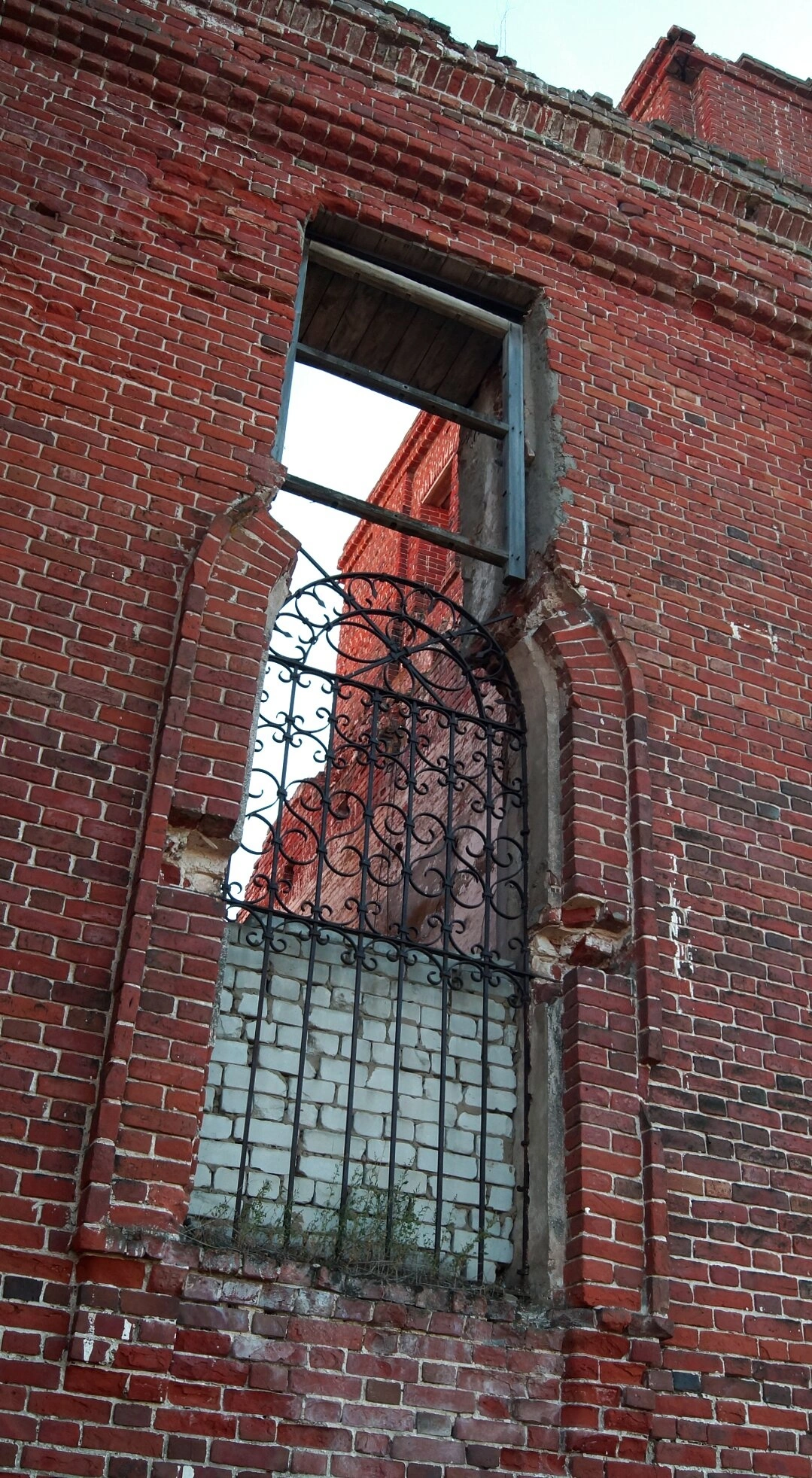Взору открывается величественный даже в своих руинах купольный свод. От былого благолепия сохранились лишь фрагменты штукатурки, сквозь которые проступает кирпичная кладка, местами осыпавшаяся от времени и небрежения. Яркий дневной свет проникает внутрь через высокие арочные оконные проёмы, лишённые когда-то украшавших их витражей или стёкол. Эти окна, подобно очам, взирают на опустевшее пространство молитвенного дома.