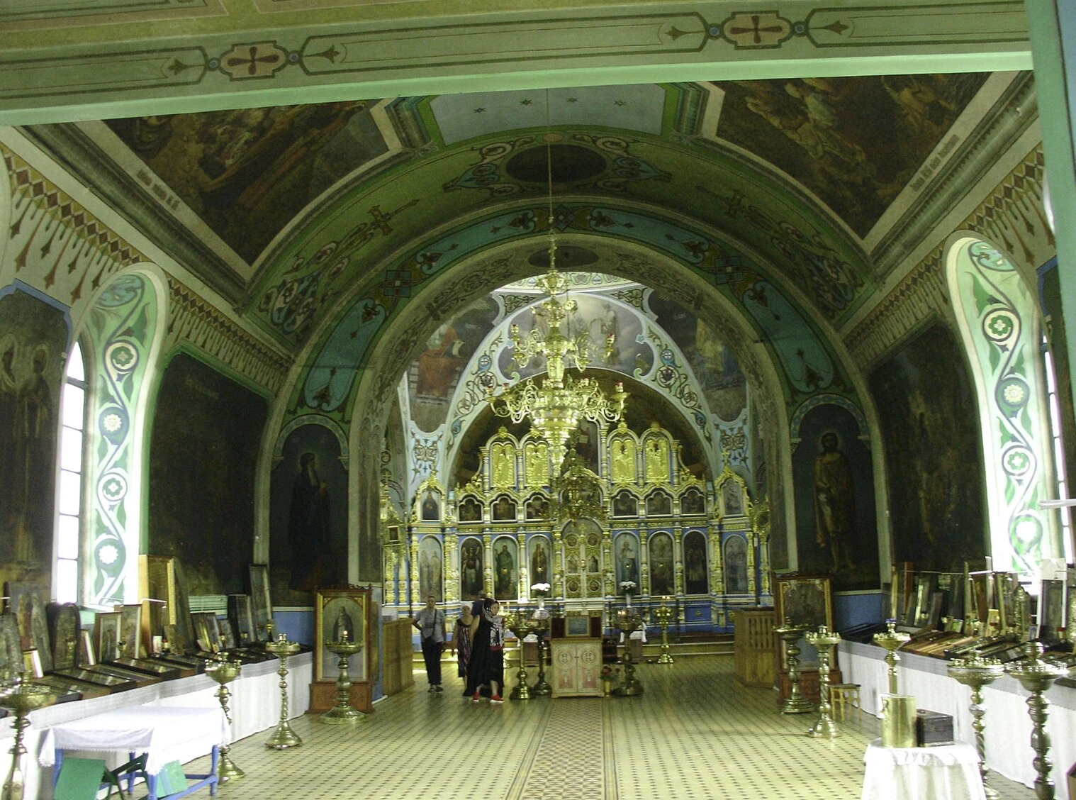 Вдоль стен расположены аналои с иконами, многие из которых почитаются как чудотворные и целительные. Прихожане имеют возможность подойти к каждой святыне для молитвенного обращения. В центральной части храма видны молящиеся — это подтверждает действующий статус церкви, где ежедневно совершаются богослужения уже более 150 лет.