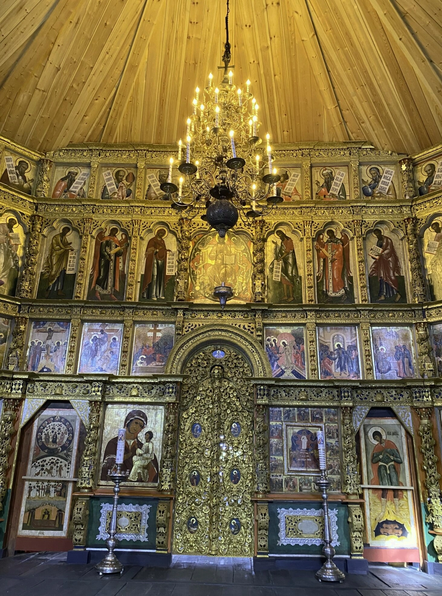 На фотографии запечатлён интерьер церкви Преображения Господня на острове Кижи – выдающегося памятника русского деревянного зодчества, включённого в список Всемирного наследия ЮНЕСКО. В центре композиции возвышается величественный четырёхъярусный иконостас, включающий 102 иконы. Его золочёная резная рама украшена растительным орнаментом, а Царские врата украшены изображениями Благовещения и четырёх евангелистов.