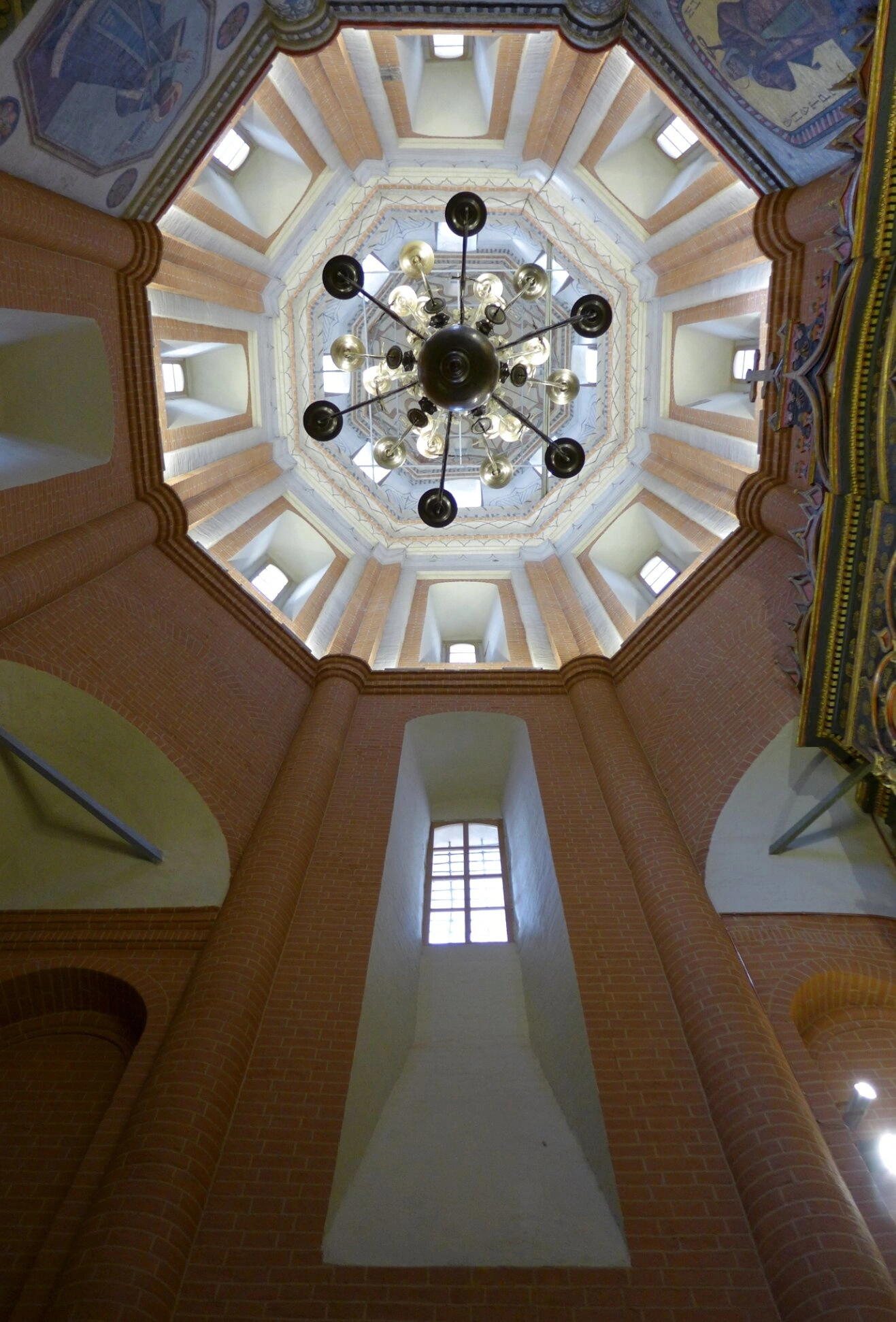 Основу композиции составляет высокий восьмигранный объём, стены которого выложены из массивного красного кирпича. Пространство плавно сужается кверху, переходя в богато украшенный свод. В центральной части свода располагается нарядная многоярусная люстра, традиционно называемая паникадилом, которое освещает внутреннее убранство.