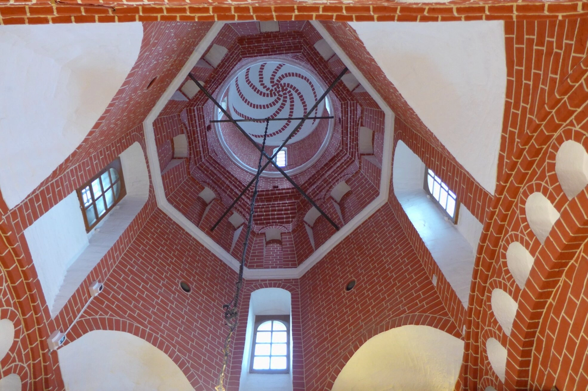 Ракурс съёмки, направленный снизу вверх, позволяет в полной мере ощутить устремлённость всего архитектурного пространства к небесам, что символизирует молитвенное предстояние перед Господом. Восьмигранное основание интерьера, сложенное из красного кирпича с чёткими белыми швами, переходит в стройные своды, покрытые светлой штукатуркой. Такое цветовое сочетание создаёт возвышенный и торжественный образ, характерный для отечественного церковного зодчества.