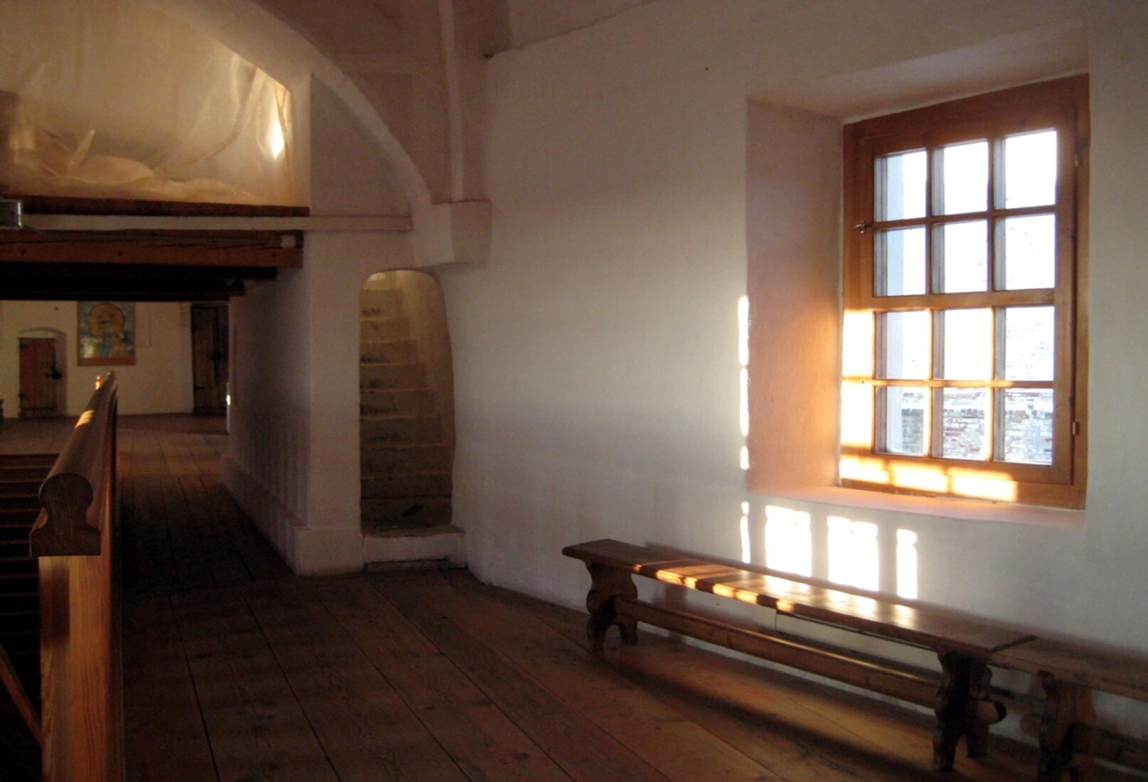 На представленной фотографии запечатлён благодатный интерьер собора Рождества Пресвятой Богородицы Ферапонтова монастыря, одной из величайших святынь Русского Севера. Храмовая архитектура, исполненная в строгих и благородных формах, создаёт особое молитвенное настроение, устремляя дух верующего к горнему миру.