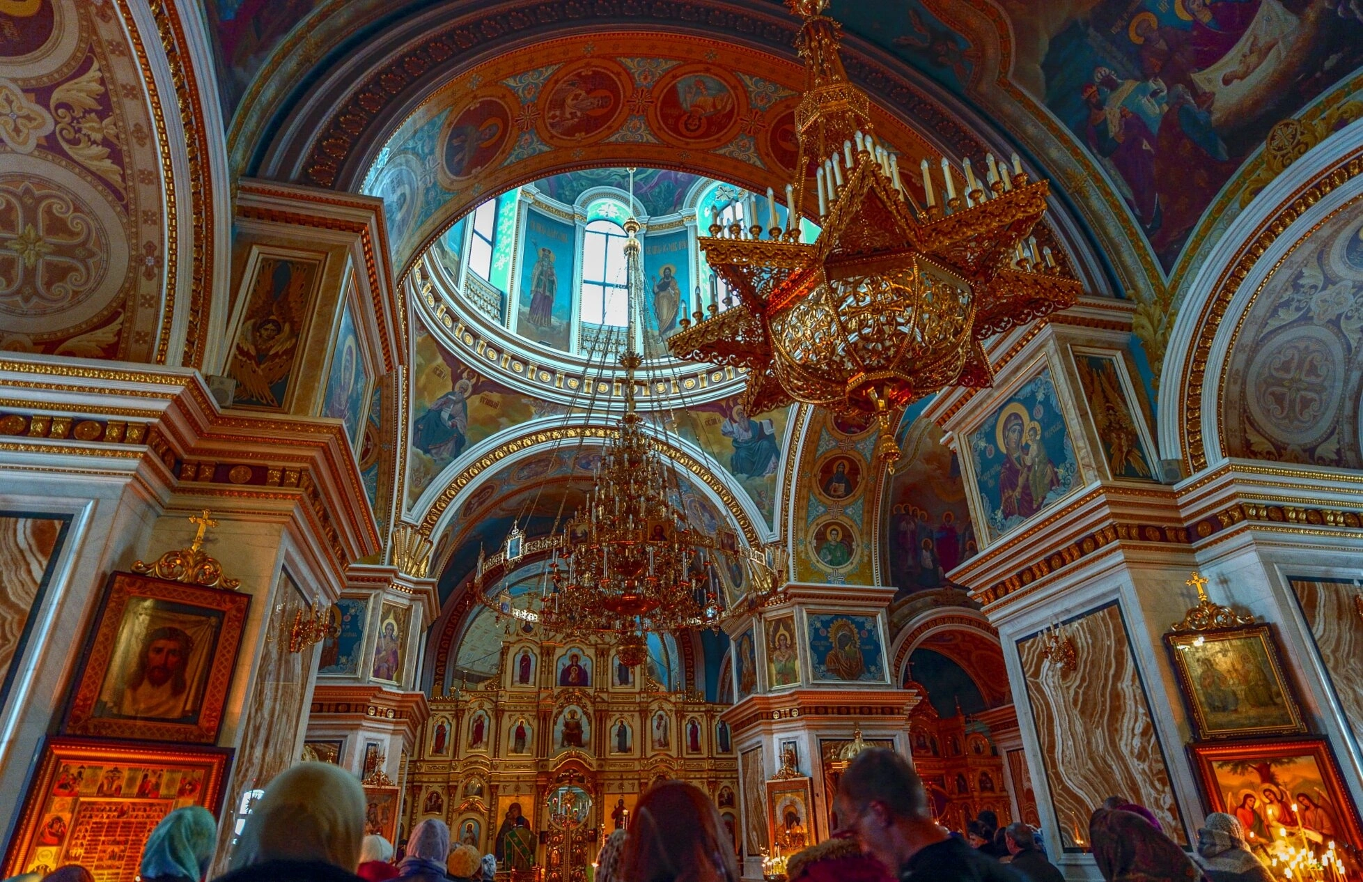 На снимке видны прихожане, присутствующие на службе или экскурсии, что подчёркивает действующий статус храма и создаёт ощущение живой церковной атмосферы. В соборе хранятся важные святыни, включая частицы мощей многих почитаемых святых и чтимые иконы, такие как образ Святой Троицы с частью дуба Мамврийского и икона Тайной Вечери с частицей Сионской Горницы.