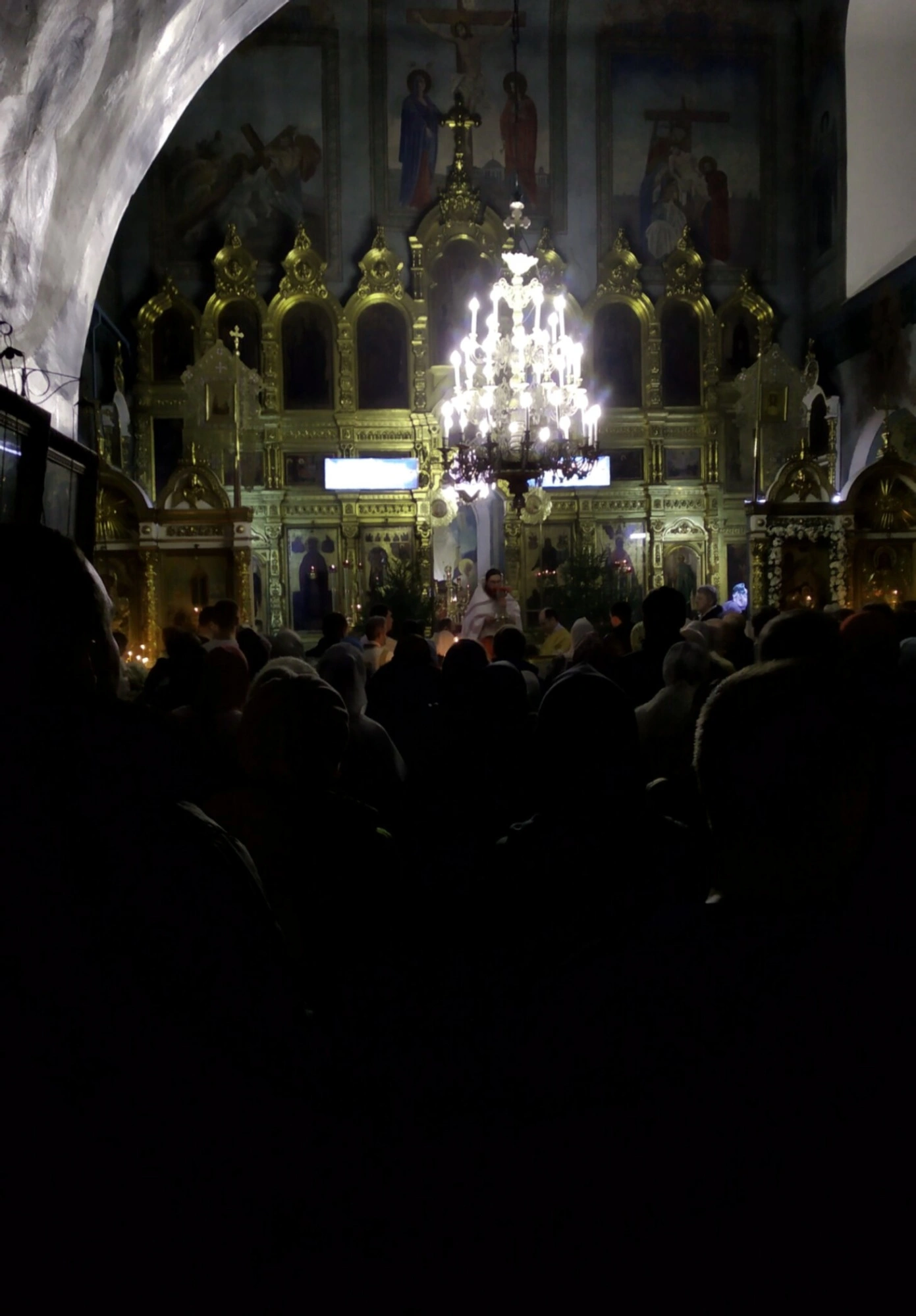 Фотография запечатлела благоговейную атмосферу богослужения в старинном Христорождественском соборе города Коврова. Приглушённое освещение и сосредоточенная молитва собравшихся создают торжественное и умиротворённое настроение, характерное для православного храма.