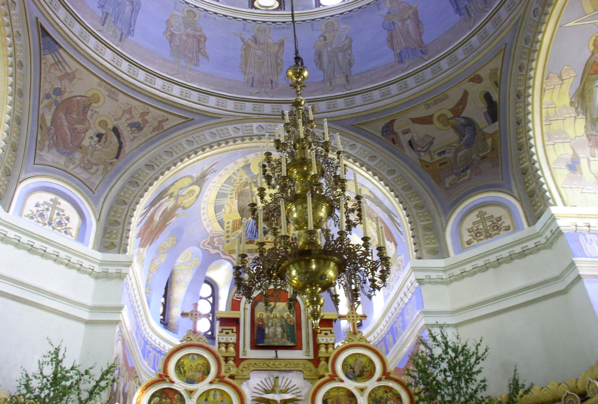 В нижней части снимка представлена часть высокого иконостаса — алтарной преграды, отделяющей алтарь от основного пространства храма. Иконостас украшен резными золочёными элементами и писаными образами Спасителя, Божией Матери и особо чтимых святых. На переднем плане также видны элементы церковного убранства, включая живую зелень, что подчёркивает особую, молитвенную атмосферу этого святого места.
