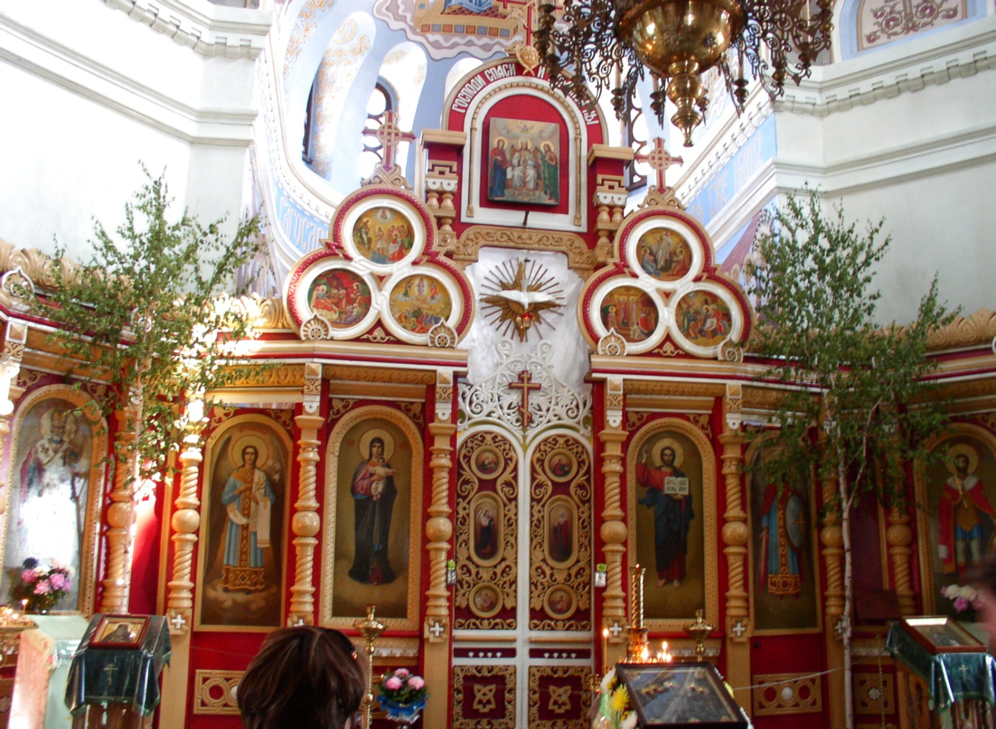 Особое внимание привлекают Царские врата, ведущие в алтарь — святая святых храма. Над вратами, в центре иконостаса, помещено символическое изображение голубя в сиянии, олицетворяющее собой Святого Духа. Этот сакральный образ напоминает верующим о сошествии Духа Утешителя на апостолов в день Пятидесятницы.
