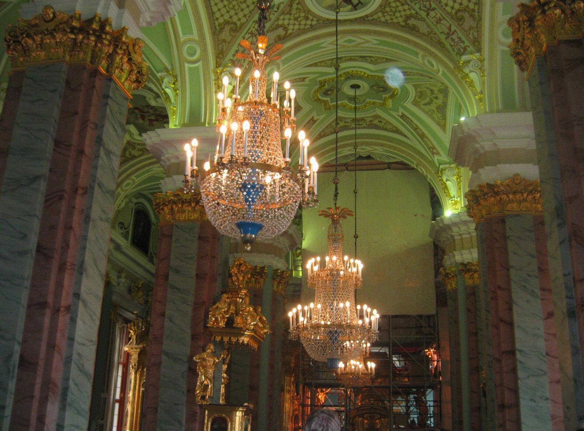В центре композиции возносятся две массивные хрустальные люстры, традиционно называемые паникадилами. Их многогранные подвески, отражая свет, создают эффект неземного сияния, наполняя соборное пространство торжественным светом. Взгляд устремляется ввысь, к сводчатому потолку, расписанному в светло-зелёных тонах изящными орнаментами и библейскими сюжетами.