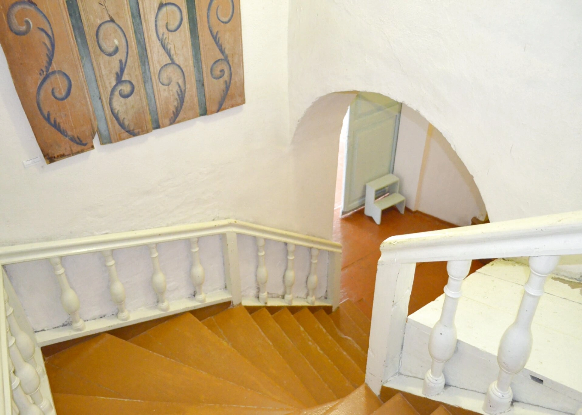 На стене, возвышающейся над лестничным маршем, размещены два декоративных панно, украшенных синими узорами. Эти элементы народного искусства придают интерьеру особый колорит и напоминают о традициях старообрядцев, некогда населявших эти земли.