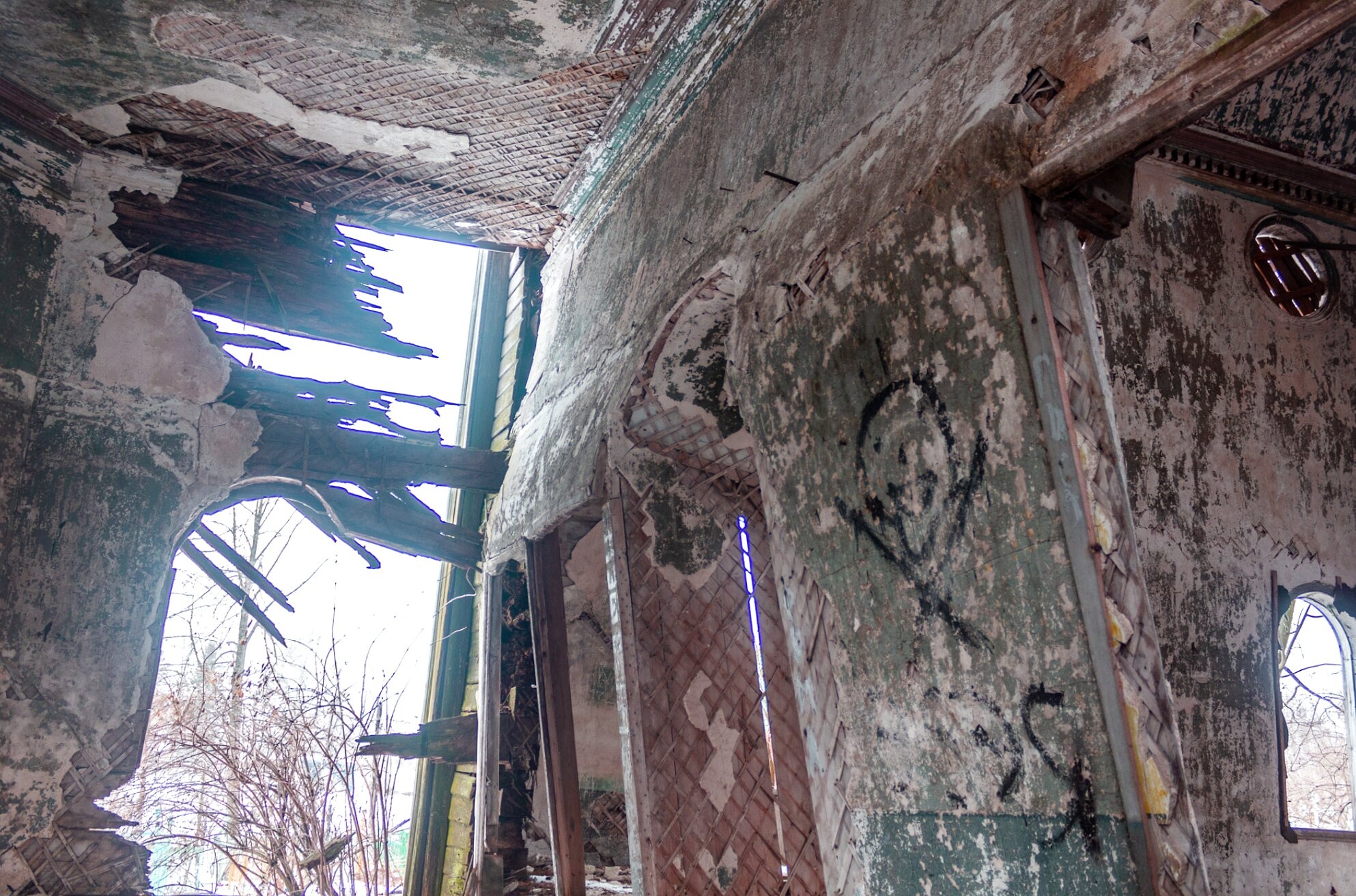 На представленной фотографии запечатлен скорбный вид интерьера Спасо-Преображенской церкви, расположенной в селе Сухаренки Городецкого района. Святое место, некогда освященное для молитв и богослужений, ныне пребывает в запустении и разрухе.