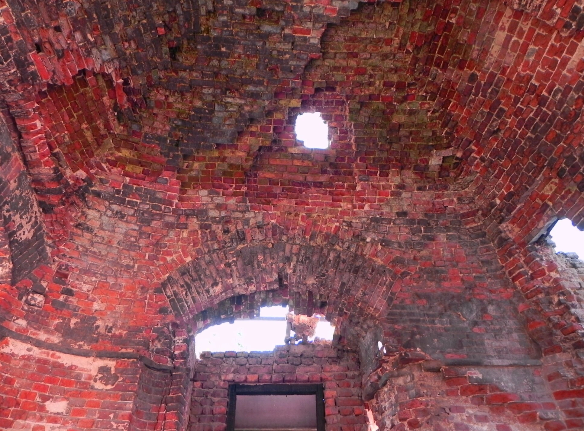 Фотография демонстрирует величественный сводчатый потолок и арочные конструкции, сложенные из красного кирпича. Кирпичная кладка, выполненная в традициях церковного зодчества, сохранила следы былого благолепия, однако ныне проявляет признаки значительного разрушения. На поверхности кирпичей видны многочисленные повреждения, а также естественные наслоения мха и плесени, свидетельствующие о длительном запустении святого места.
