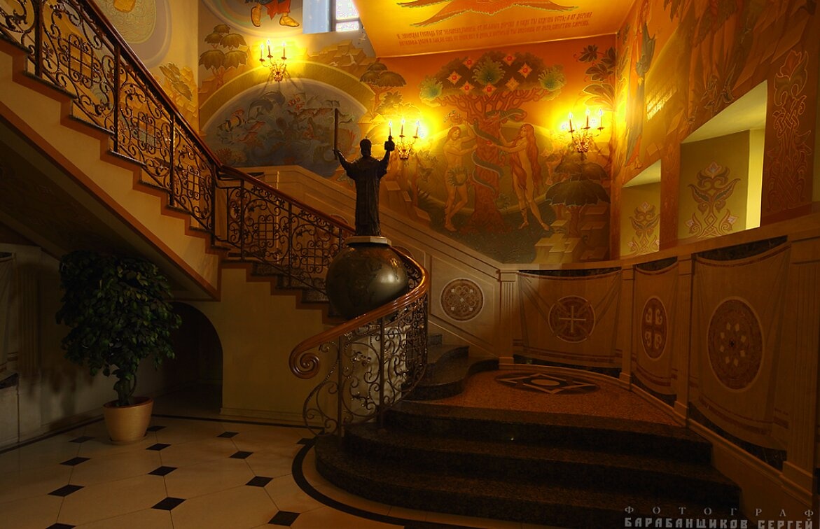 У основания лестницы на мраморном постаменте установлена скульптурная композиция, изображающая святого угодника Божия в полный рост. В руках святой держит зажжённые свечи, символизирующие свет веры и молитвы, озаряющие путь христианина. Этот художественный элемент подчёркивает глубокую символику внутреннего пространства собора.