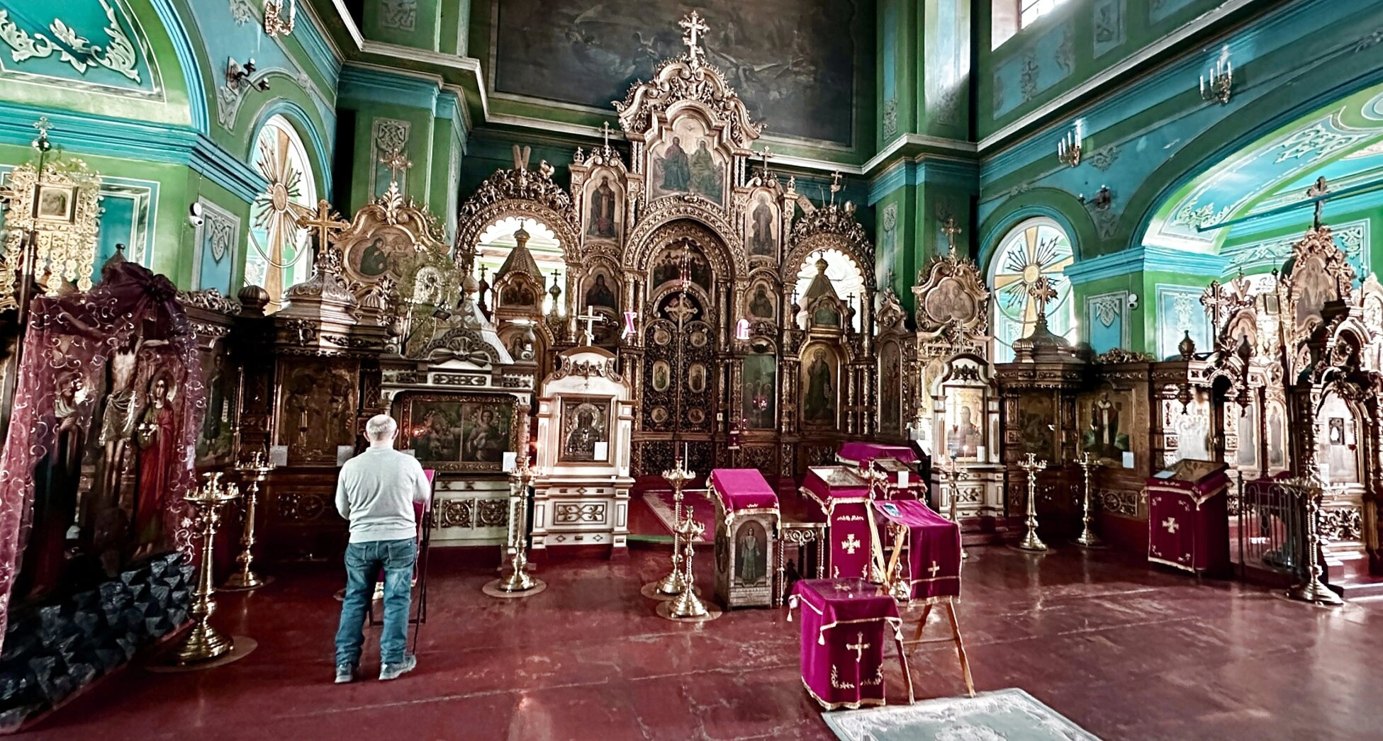 На снимке у правого клироса запечатлён прихожанин, стоящий спиной к зрителю. Его фигура придаёт фотографии особый смысл, подчёркивая предназначение храма как дома молитвы и напоминая о личном предстоянии каждого человека перед Богом. Естественное освещение, проникающее внутрь, мягко высвечивает детали убранства, что позволяет в полной мере оценить красоту и благолепие этого святого места.