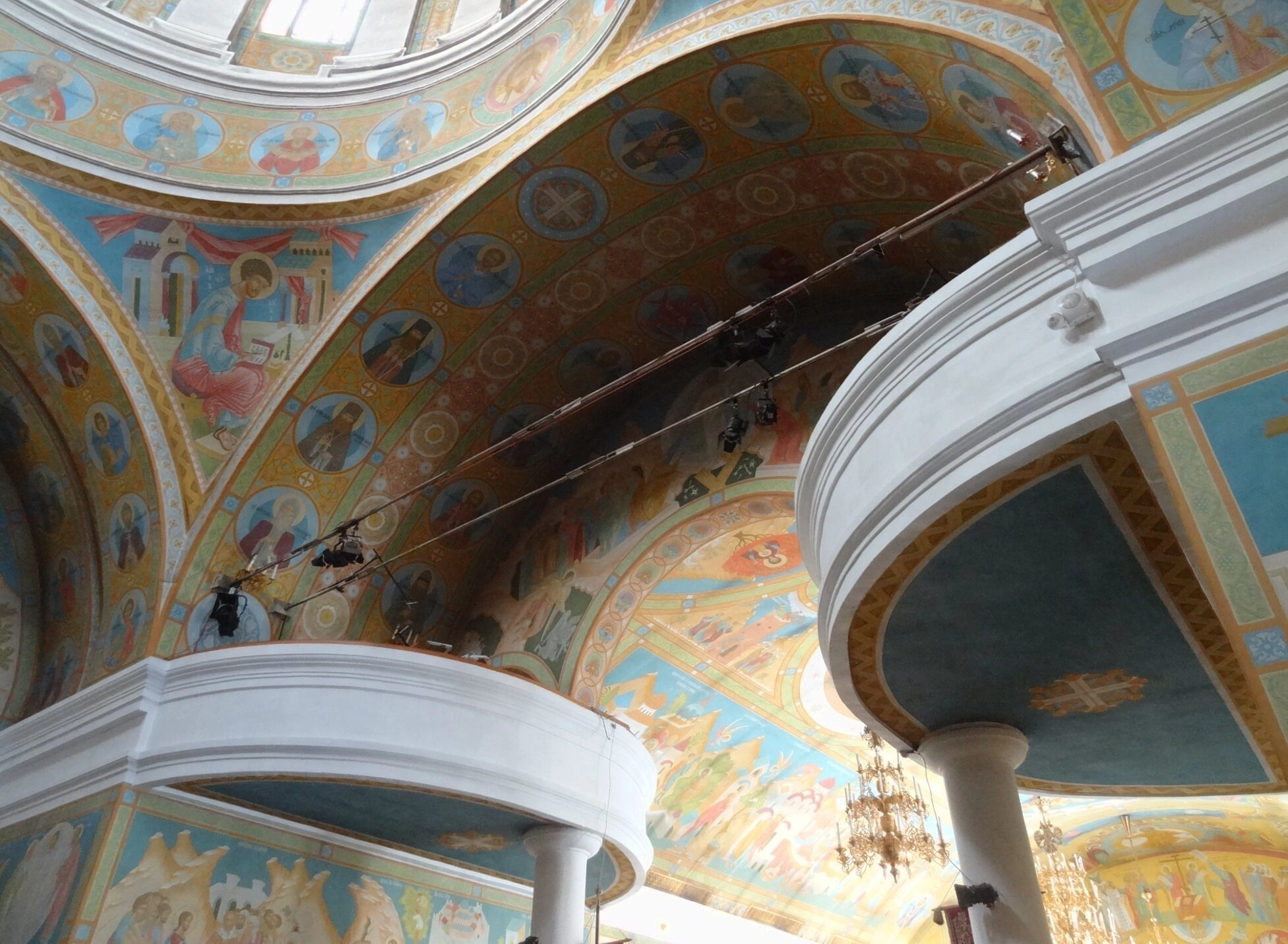 Освещение храмового пространства обеспечивают подвесные светильники и центральная люстра, элементы которой видны в нижней части кадра. Естественное освещение проникает через оконные проемы в купольной части, мягко высвечивая детали росписи и создавая особую молитвенную атмосферу.