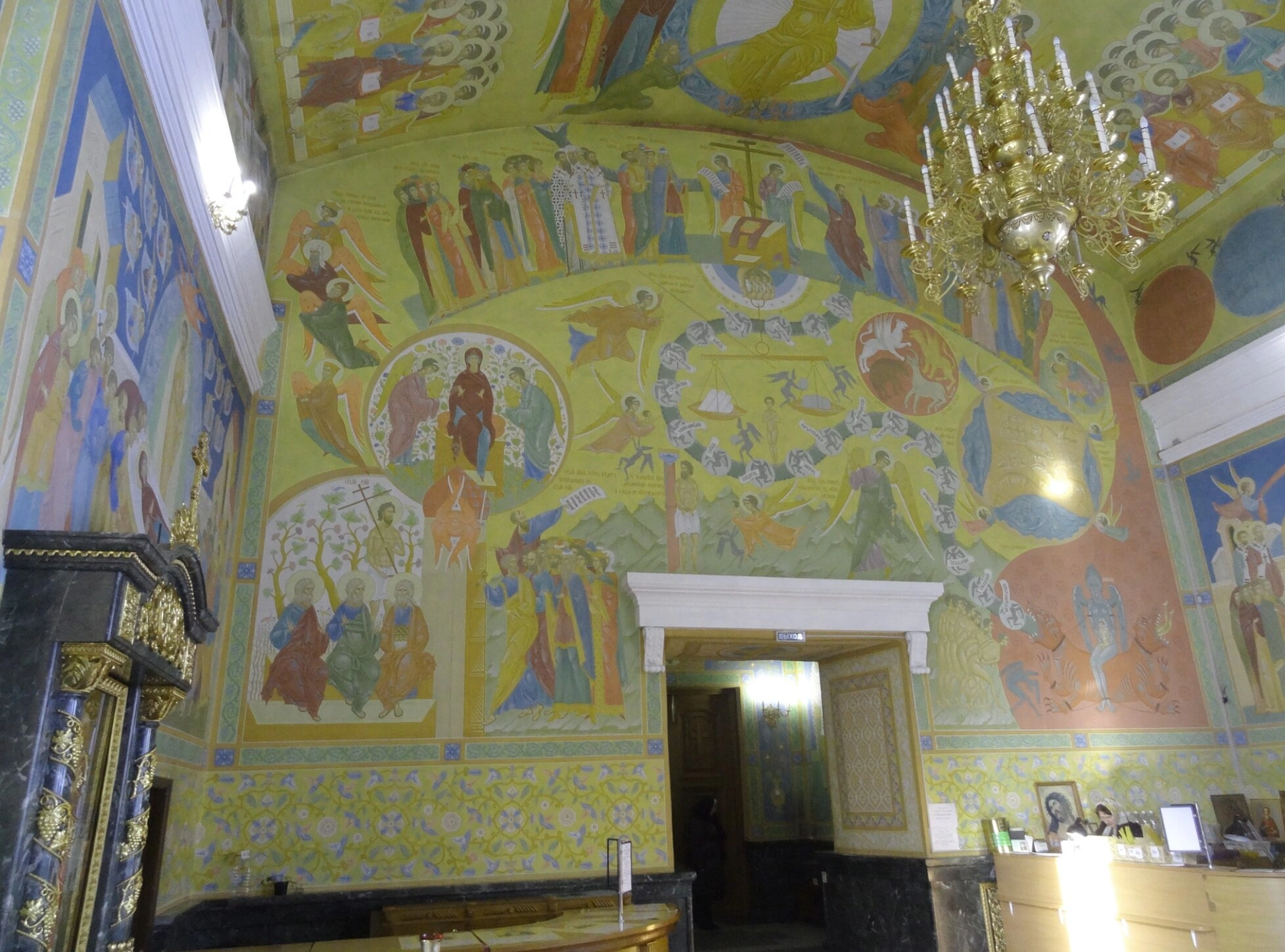 В центральной части композиции над арочным дверным проемом расположена монументальная фреска, изображающая Господа нашего Иисуса Христа в окружении небесных сил. Художественное исполнение соответствует канонам древнерусской иконописной школы с элементами византийского стиля. По сводам и стенам храма размещены многочисленные росписи на библейские сюжеты, выполненные в традиционной цветовой гамме с преобладанием золотых, багряных, лазурных и охристых тонов.
