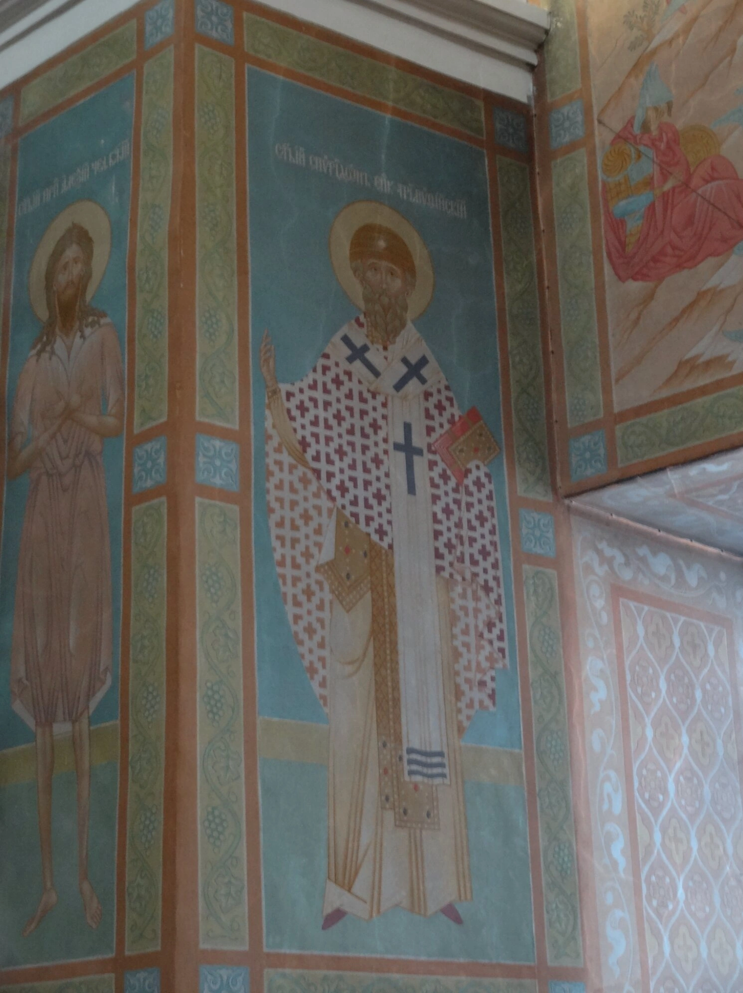Своды и верхние части стен храма обильно покрыты яркими и красочными фресками, выполненными в русской манере XVI столетия. На них изображены библейские сюжеты и лики святых. В оформлении преобладают пастельные, золотистые и тёплые тона, создающие торжественную и одухотворённую атмосферу. Пространство освещает большая, многоярусная люстра из позолоченного металла, дополненная настенными светильниками. Естественный свет, проникающий через высокие окна, мягко ложится на светлую поверхность пола, который отражает его, добавляя интерьеру ощущение воздушности и простора.