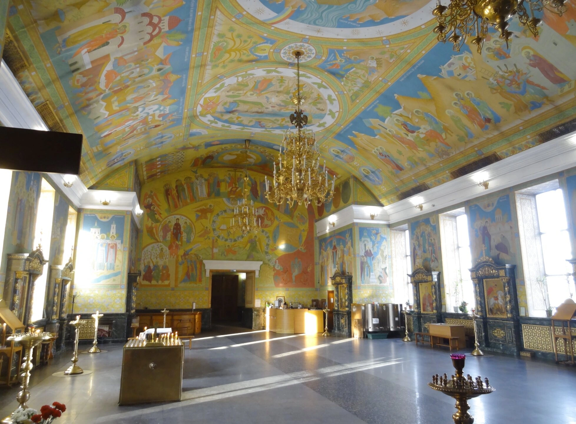 Своды и верхние части стен храма обильно покрыты яркими и красочными фресками, выполненными в русской манере XVI столетия. На них изображены библейские сюжеты и лики святых. В оформлении преобладают пастельные, золотистые и тёплые тона, создающие торжественную и одухотворённую атмосферу. Пространство освещает большая, многоярусная люстра из позолоченного металла, дополненная настенными светильниками. Естественный свет, проникающий через высокие окна, мягко ложится на светлую поверхность пола, который отражает его, добавляя интерьеру ощущение воздушности и простора.