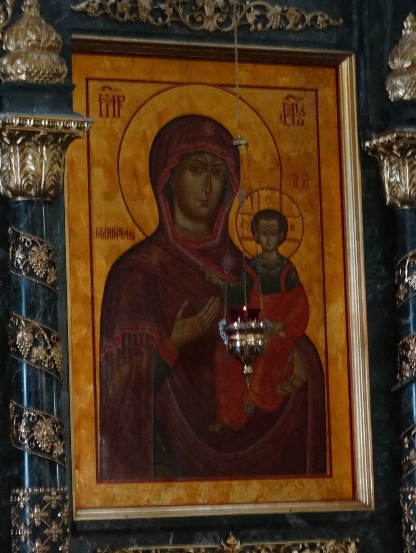 Ниже фрески, вдоль стены, размещены три иконы в рамах. Центральная икона в позолоченном окладе, вероятно, изображает сцену Рождества Христова или одного из двунадесятых праздников. Справа от неё находится поясной образ святого с тёмным ликом и золотым нимбом. Слева от центральной иконы виден проём или закрытая дверь. Стены под росписью украшены декоративным узором, а слева в кадр попадает часть массивной белой колонны. На переднем плане заметны элементы церковной утвари, включая подсвечник. Потолок окрашен в синий цвет с декоративными элементами, что завершает целостное восприятие храмового пространства.