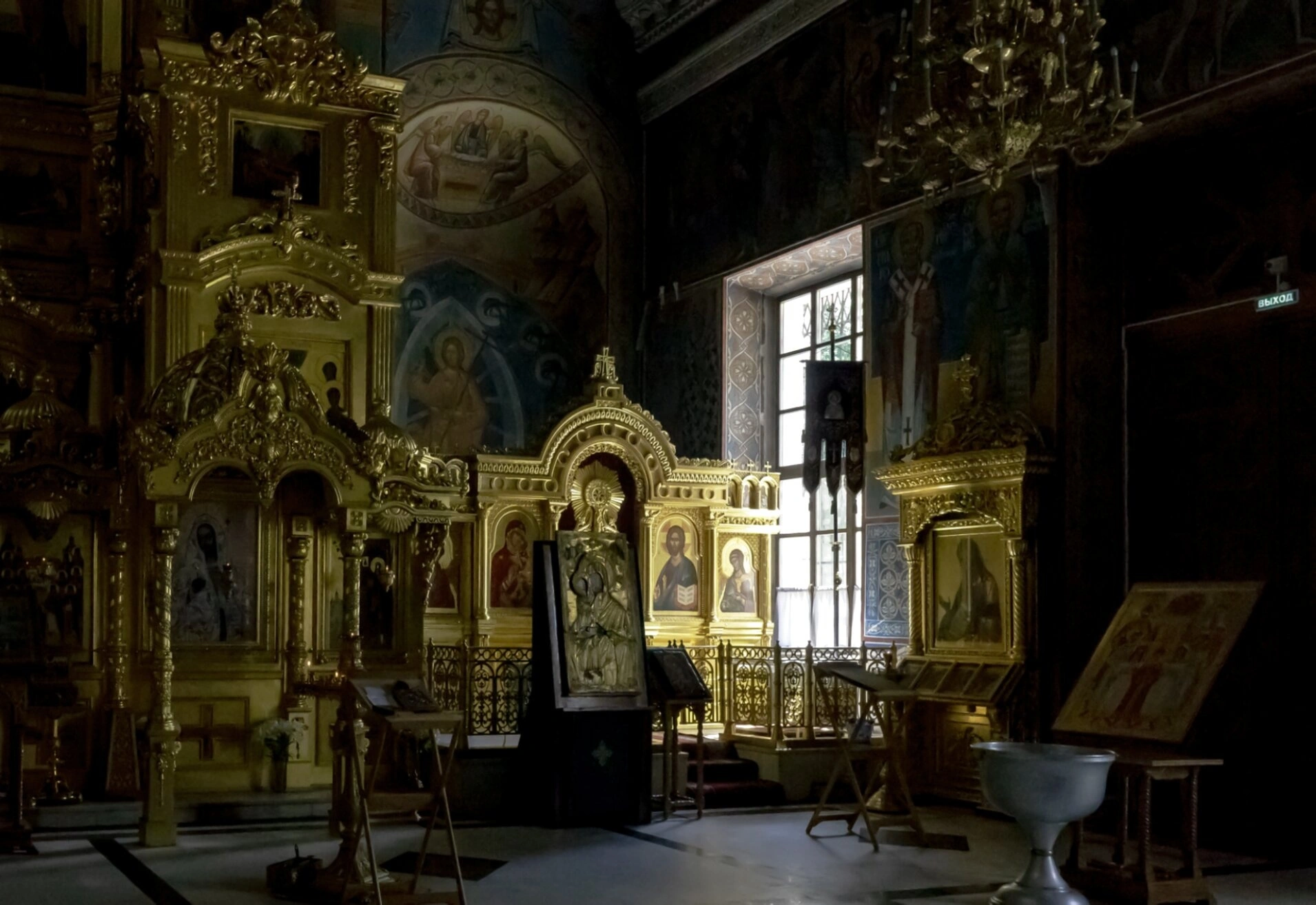 Стены и своды храма сплошь покрыты художественными росписями, изображающими сцены из Священного Писания, лики святых и евангельские события. Эти фрески, выполненные в традиционной православной манере, не только украшают пространство, но и выполняют важную катехизическую функцию, повествуя об истории спасения через яркие зрительные образы.