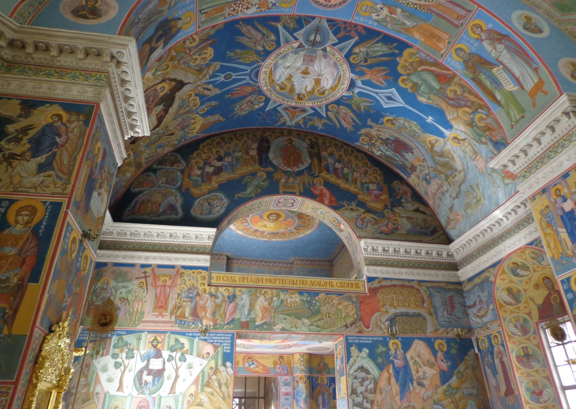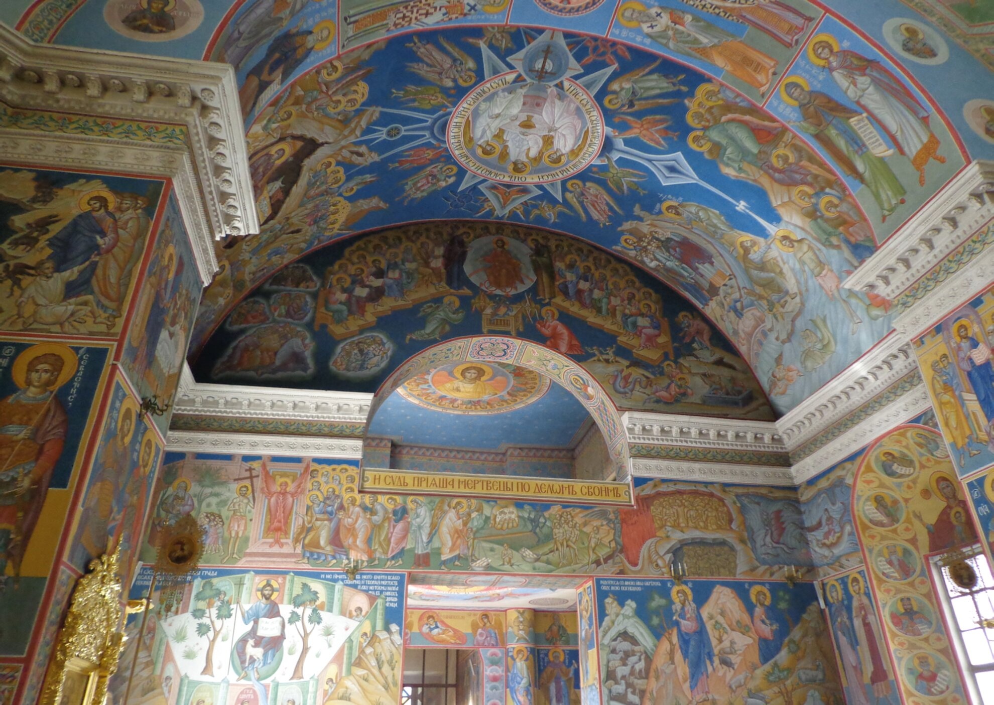 Особого внимания заслуживают купольные росписи, где представлены небесные сцены, лики святых и ангельских сил. Композиции в куполе символизируют Божественную славу и торжество Небесного Царства, напоминая молящимся о их духовной цели. Естественный свет, проникающий через арочные окна, мягко освещает интерьер, оживляя краски фресок и подчеркивая их художественное совершенство.