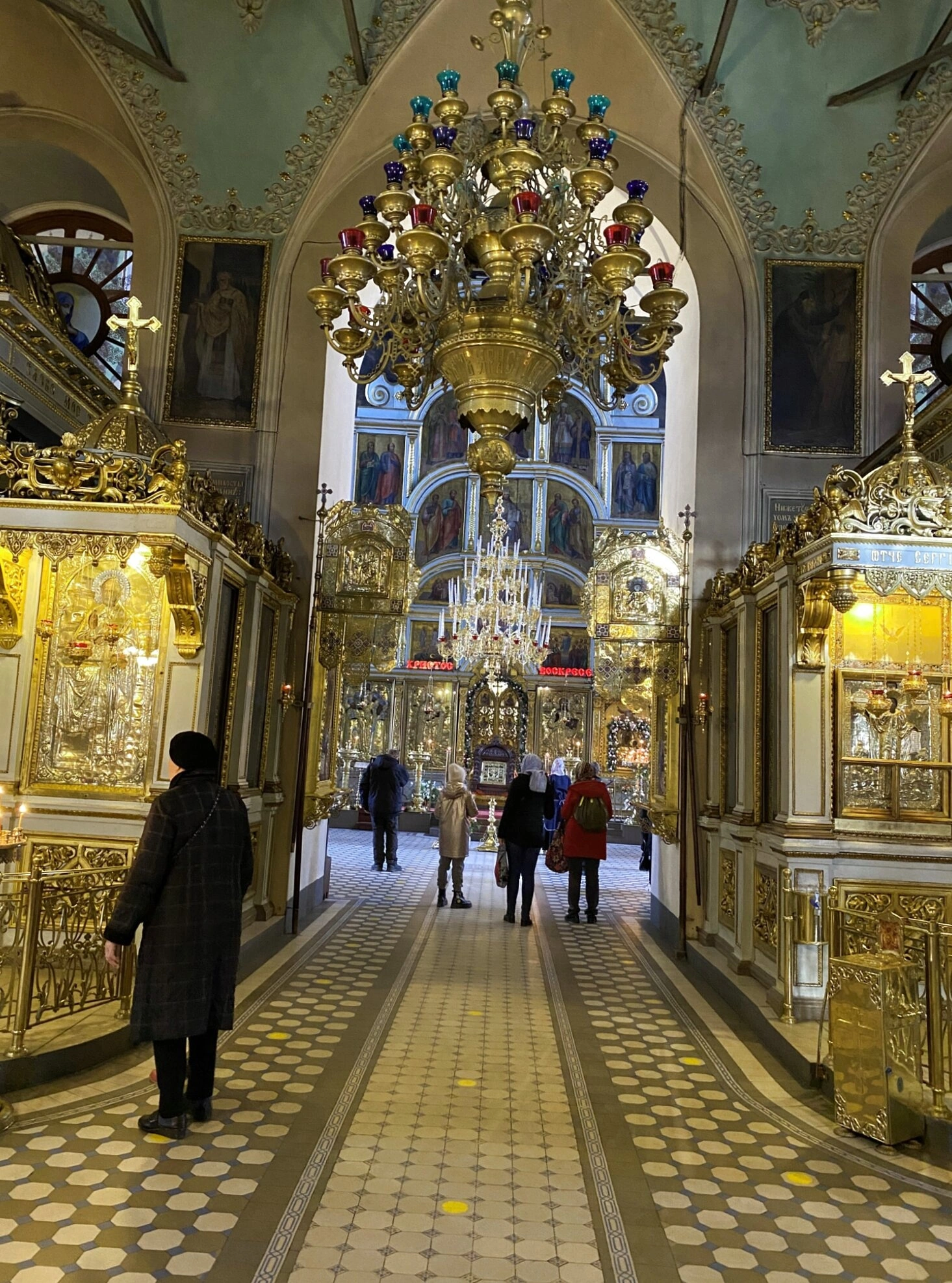 На снимке присутствуют прихожане и посетители храма, однако люди изображены не крупным планом, а в общем плане интерьера, что позволяет сосредоточить внимание на архитектурных и художественных особенностях святыни.