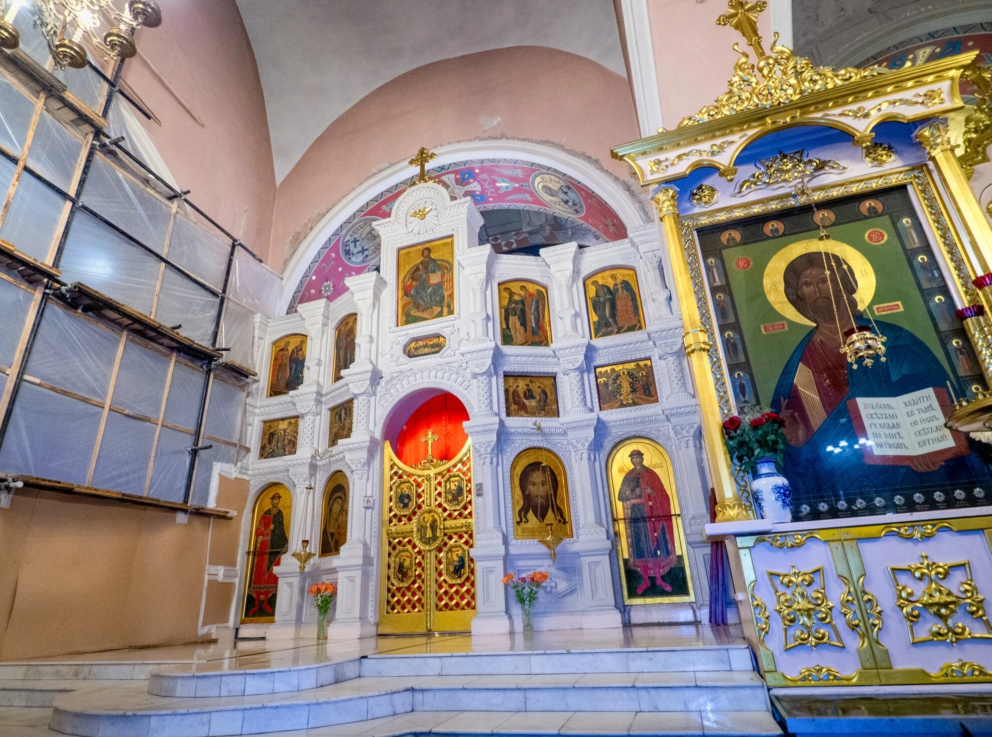 Справа от иконостаса располагается крупная икона Спасителя, художественное исполнение которой выделяется глубокими зелёными тонами и сияющим золотым нимбом. Высокие своды храма устремляются вверх, символизируя горний мир и усиливая молитвенное настроение. Присутствие строительных лесов на заднем плане свидетельствует о проводимых реставрационных работах, направленных на сохранение этого духовного и архитектурного сокровища для будущих поколений.