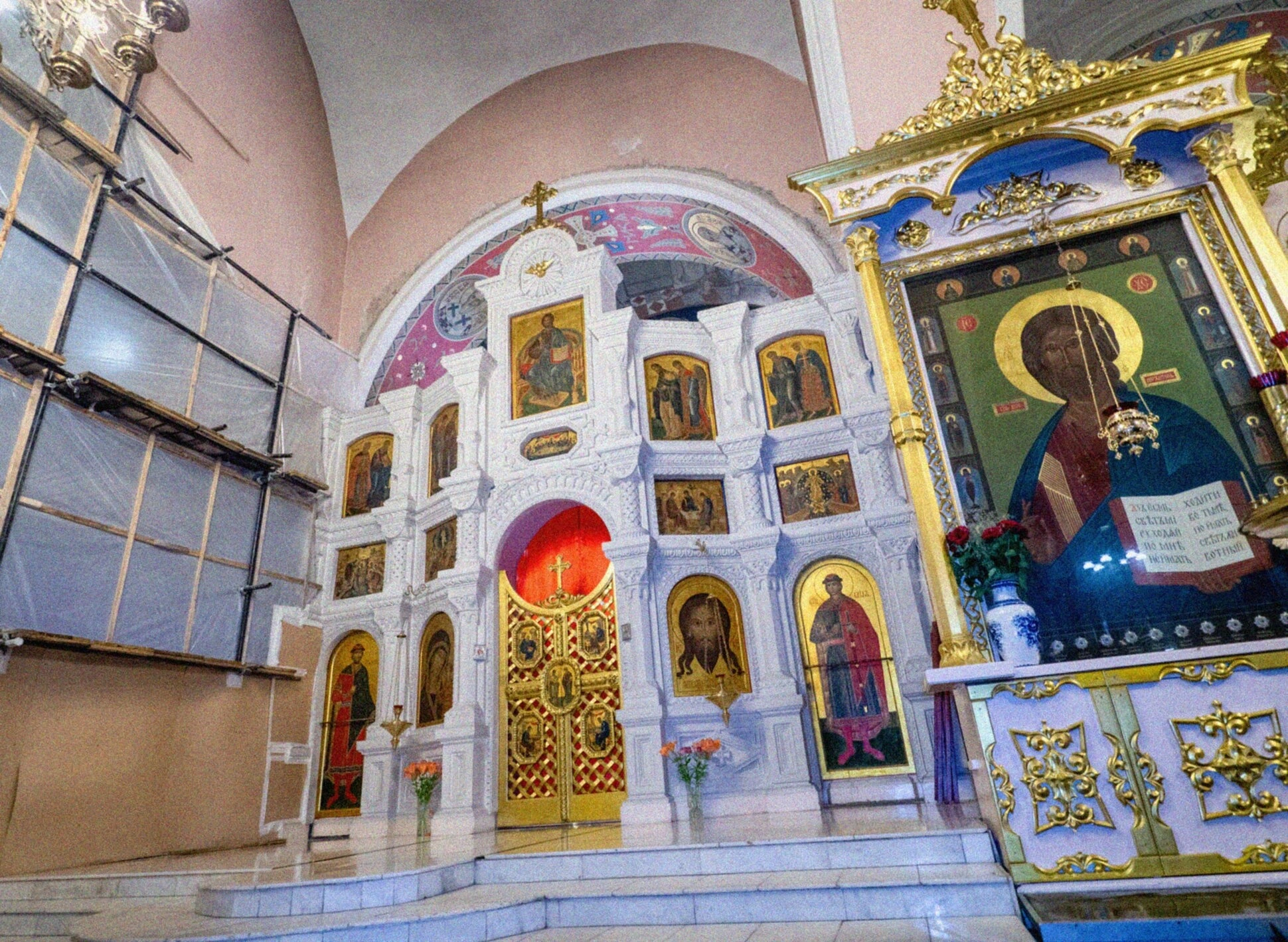Левая часть помещения на момент съёмки была закрыта строительными лесами, что свидетельствует о проведении реставрационных или ремонтных работ, направленных на сохранение и поддержание благолепия этого святого места. Естественный свет, проникающий внутрь, мягко освещает интерьер, подчёркивая духовную торжественность и благоговейную атмосферу домостроительства Божия. Данный снимок не только фиксирует архитектурные детали, но и передаёт глубокое молитвенное настроение, присущее православным храмам.