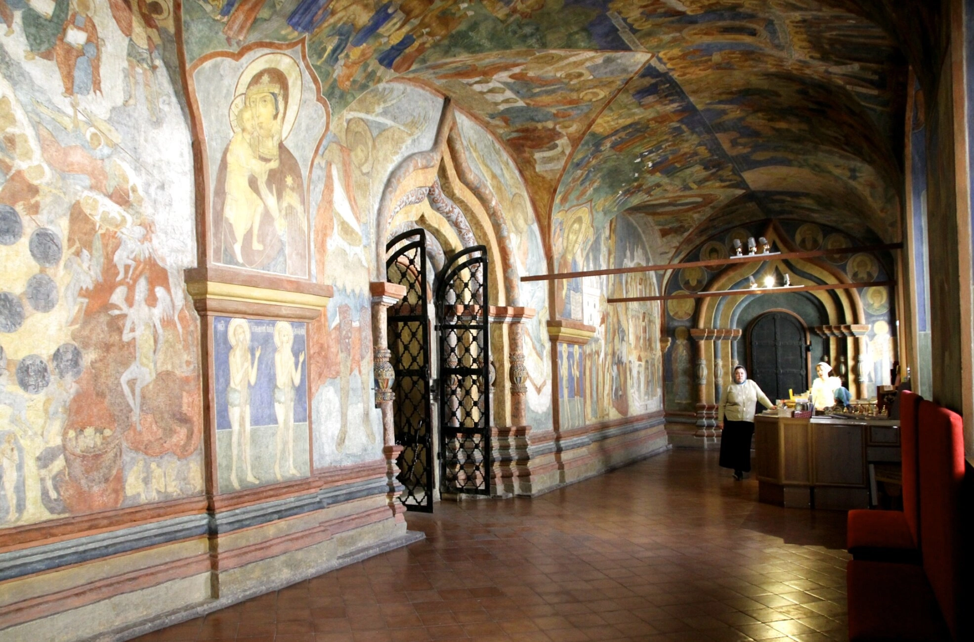 На представленной фотографии запечатлен интерьер Свято-Троицкого собора Ипатьевского монастыря в Костроме, одного из наиболее значимых памятников русского православного зодчества. Снимок демонстрирует сводчатую галерею храма, стены и потолок которой полностью покрыты уникальными фресковыми росписями XVII столетия.